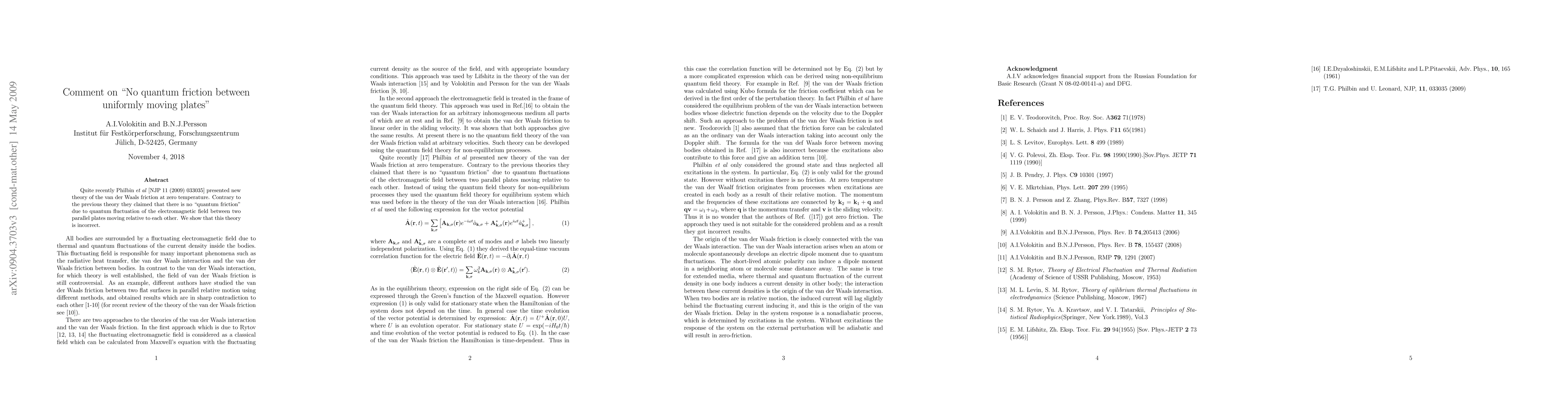 Quite recently Philbin et al present new theory of the van der Waals friction at zero temperature. Contrary to the previous theory they claimed that there is no "quantum friction" due to quantum fluctuation of the electromagnetic field between two parallel plates moving relative to each other. We show that this theory is incorrect.