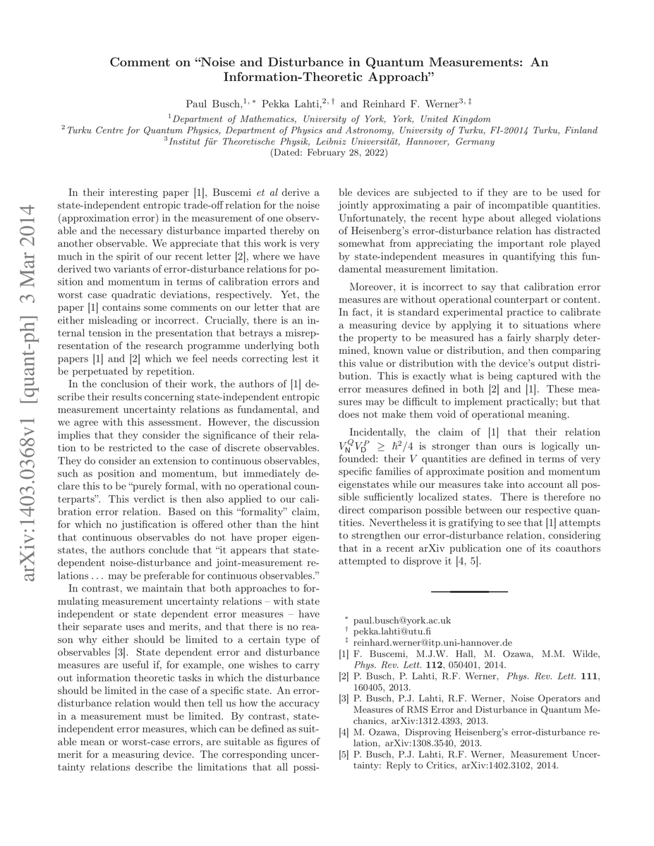 In this comment on the work of F. Buscemi, M.J.W. Hall, M. Ozawa and M.M. Wilde [PRL 112, 050401, 2014, arXiv:1310.6603], we point out a misrepresentation of measures of error and disturbance introduced in our recent work [PRL 111, 160405, 2013, arXiv:1306.1565] as being "purely formal, with no operational counterparts". We also exhibit an tension in the authors' message, in that their main result is an error-disturbance relation for state-independent measures, but its importance is declared to be limited to discrete variables. In contrast, we point out the separate roles played by such relations for either state-dependent or state-independent measures of error and disturbance.