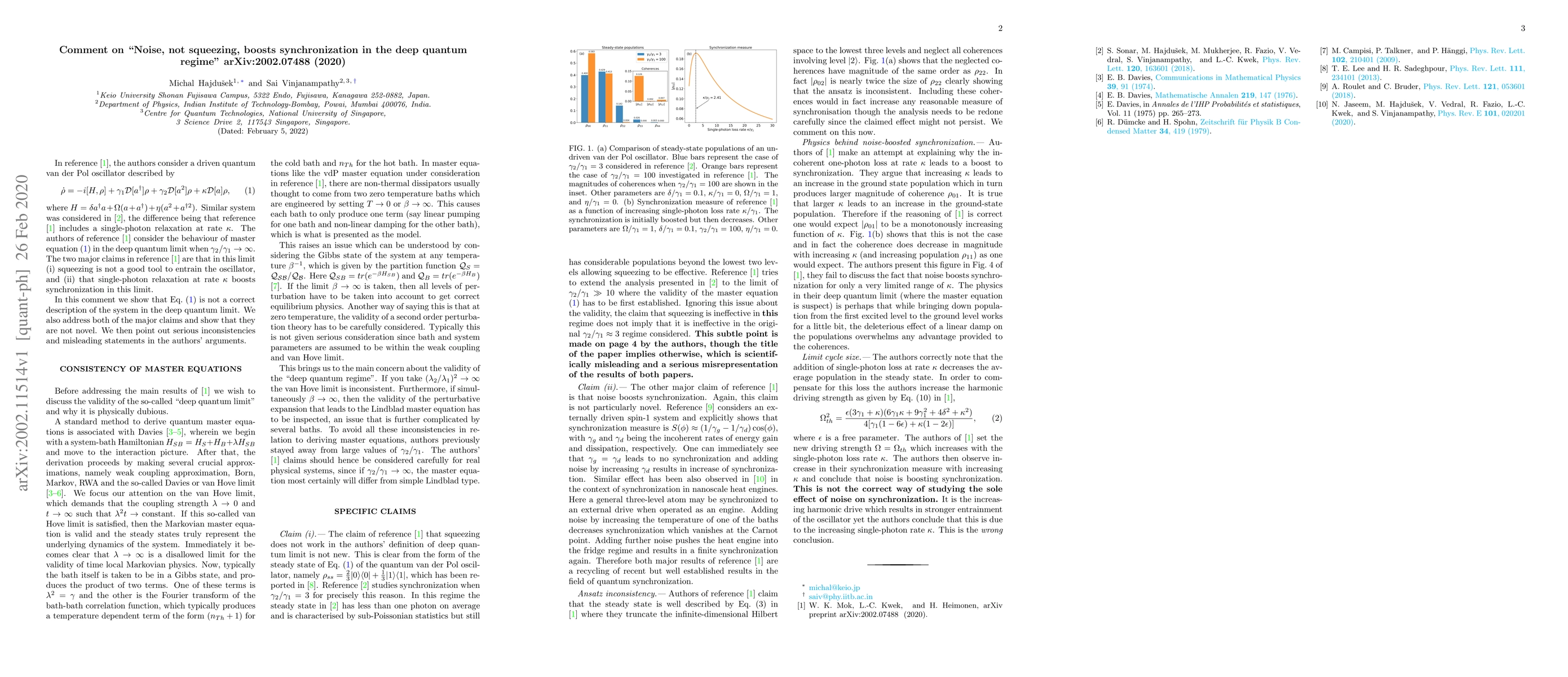 A recent manuscript ( arXiv:2002.07488 (2020) ) compares the effect of linear dissipators and squeezing drive on quantum synchronisation. We point at serious mistakes in the validity of the equations they use, the consistency of the ansatz employed, the unregulated fashion in which parameters are varied and the misleading scientific statements made in their manuscript.
