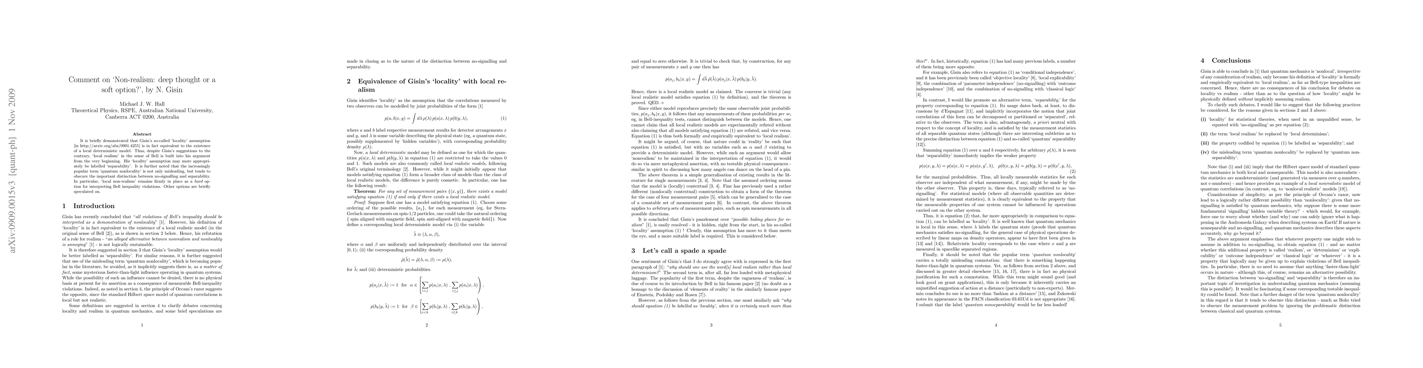 It is briefly demonstrated that Gisin's so-called 'locality' assumption [arXiv:0901.4255] is in fact equivalent to the existence of a local deterministic model. Thus, despite Gisin's suggestions to the contrary, 'local realism' in the sense of Bell is built into his argument from the very beginning. His 'locality' assumption may more appropriately be labelled 'separability'. It is further noted that the increasingly popular term 'quantum nonlocality' is not only misleading, but tends to obscure the important distinction between no-signalling and separability. In particular, 'local non-realism' remains firmly in place as a hard option for interpreting Bell inequality violations. Other options are briefly speculated on.