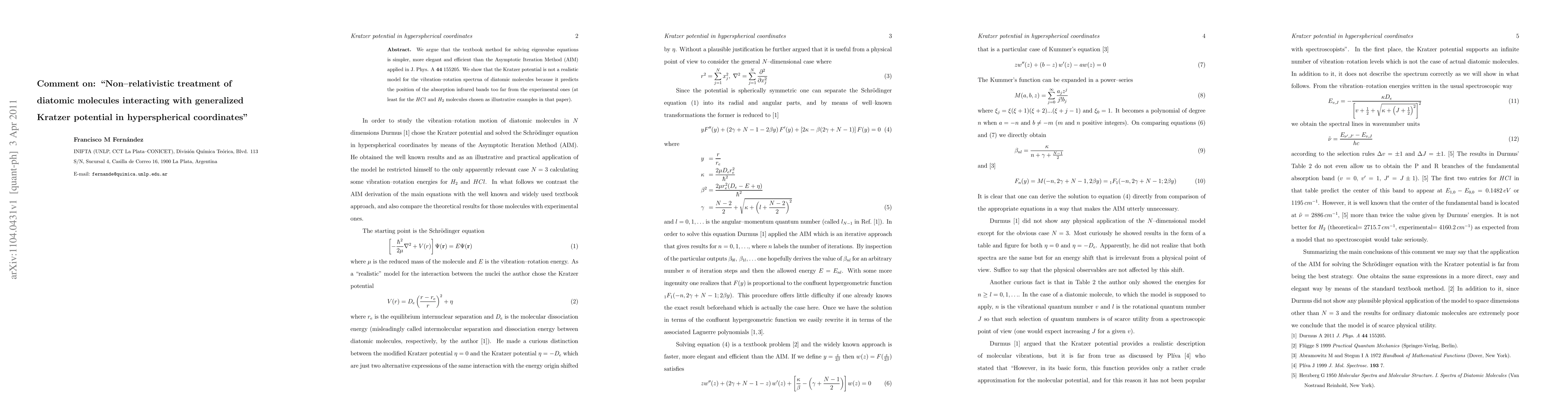 We argue that the textbook method for solving eigenvalue equations is simpler, more elegant and efficient than the Asymptotic Iteration Method (AIM) applied in J. Phys. A {\bf 44} 155205. We show that the Kratzer potential is not a realistic model for the vibration--rotation spectrua of diatomic molecules because it predicts the position of the absorption infrared bands too far from the experimental ones (at least for the $HCl$ and $H_2$ molecules chosen as illustrative examples in that paper).