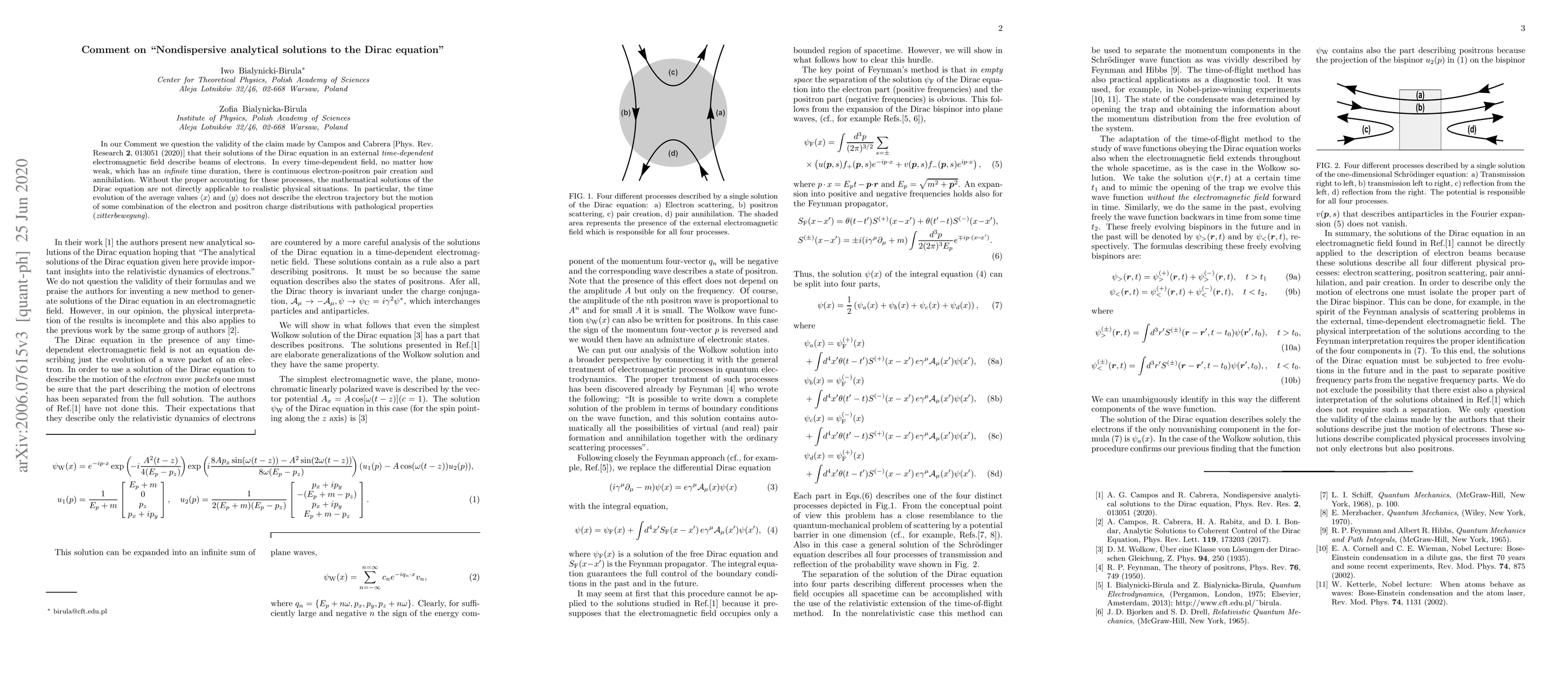 A research paper challenges a claim about analytical solutions to the Dirac equation in an external electromagnetic field, arguing that real-world situations cannot be accurately described without accounting for electron-positron pair creation.