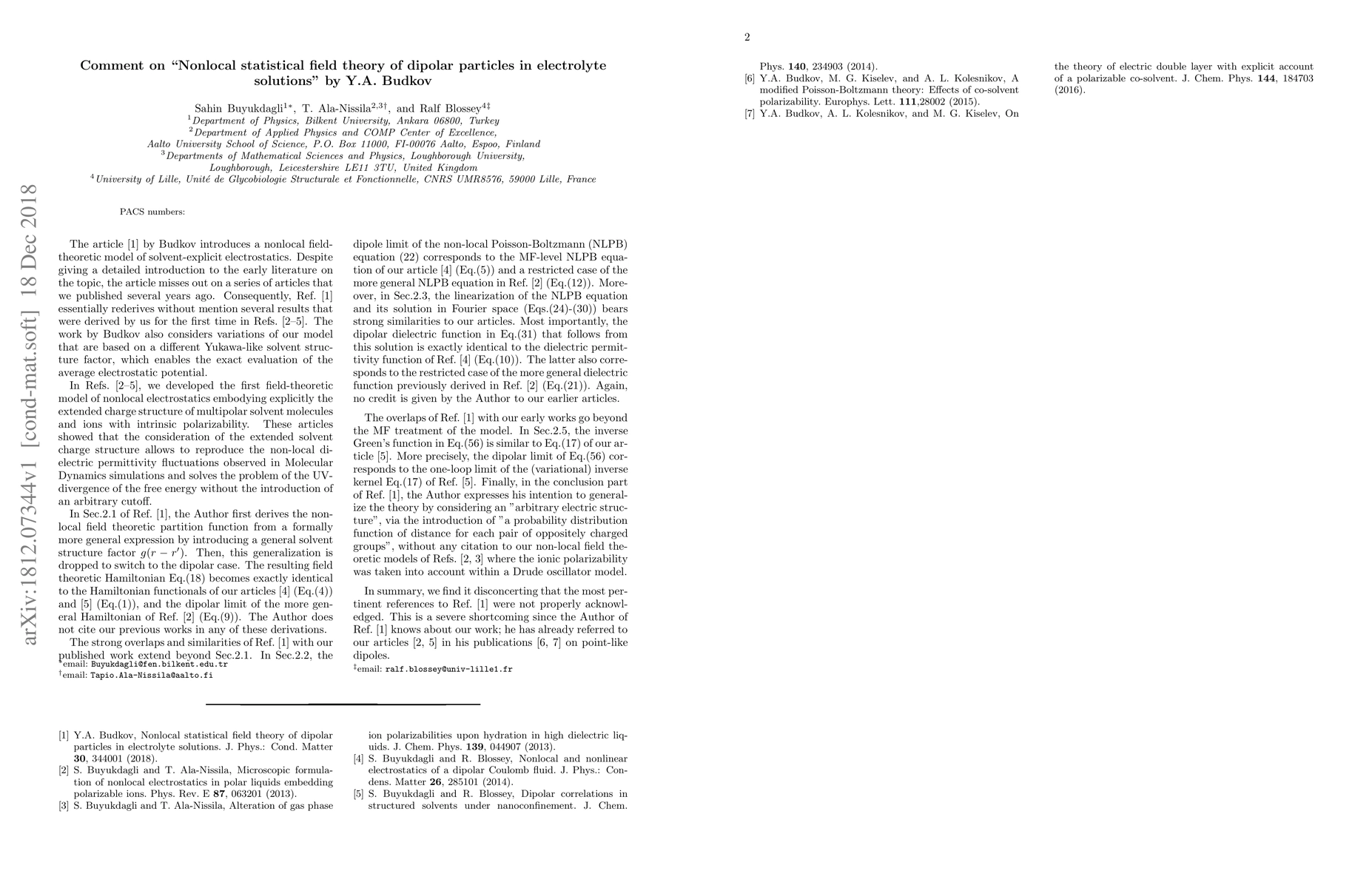 The article by Budkov introduces a nonlocal field-theoretic model of solvent-explicit electrostatics. Despite giving a detailed introduction to the early literature on the topic, the article misses out on a series of articles that we published several years ago. Consequently, the manuscript essentially rederives without mention several results that were derived by us for the first time.