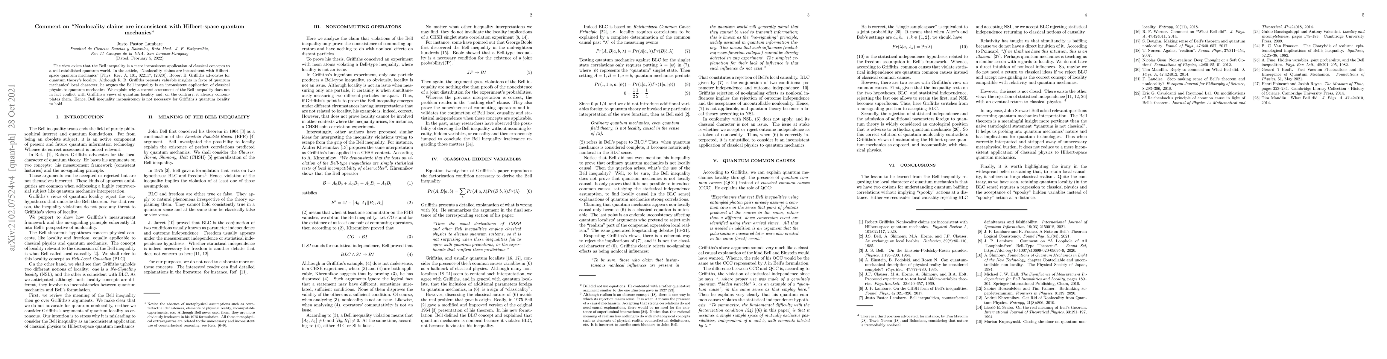 The view exists that the Bell inequality is a mere inconsistent application of classical concepts to a well-established quantum world. In the article, ``Nonlocality claims are inconsistent with Hilbert-space quantum mechanics'' [Phys. Rev. A, 101, 022117, (2020)], Robert B. Griffiths advocates for quantum theory's locality. Although R. B. Griffiths presents valuable insights in favor of quantum mechanics' local character, he argues the Bell inequality is an inconsistent application of classical physics to quantum mechanics. We explain why a correct assessment of the Bell inequality does not in fact conflict with Griffiths's views of quantum locality and, on the contrary, it already contemplates them. Hence, Bell inequality inconsistency is not necessary for Griffiths's quantum locality to hold.