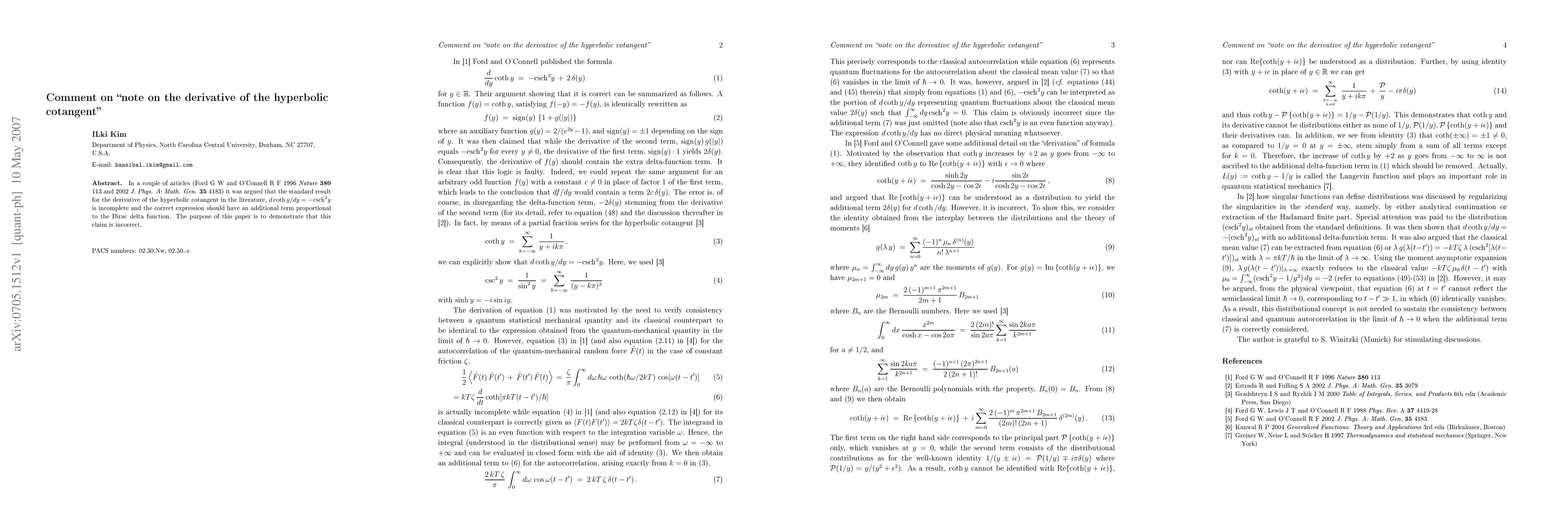 In a couple of articles (Ford G W and O'Connell R F 1996 Nature 380 113 and 2002 J. Phys. A: Math. Gen. 35 4183) it was argued that the standard result for the derivative of the hyperbolic cotangent in the literature, d \coth y/dy = -{csch}^2 y is incomplete and the correct expression should have an additional term proportional to the Dirac delta function. The purpose of this paper is to demonstrate that this claim is incorrect.