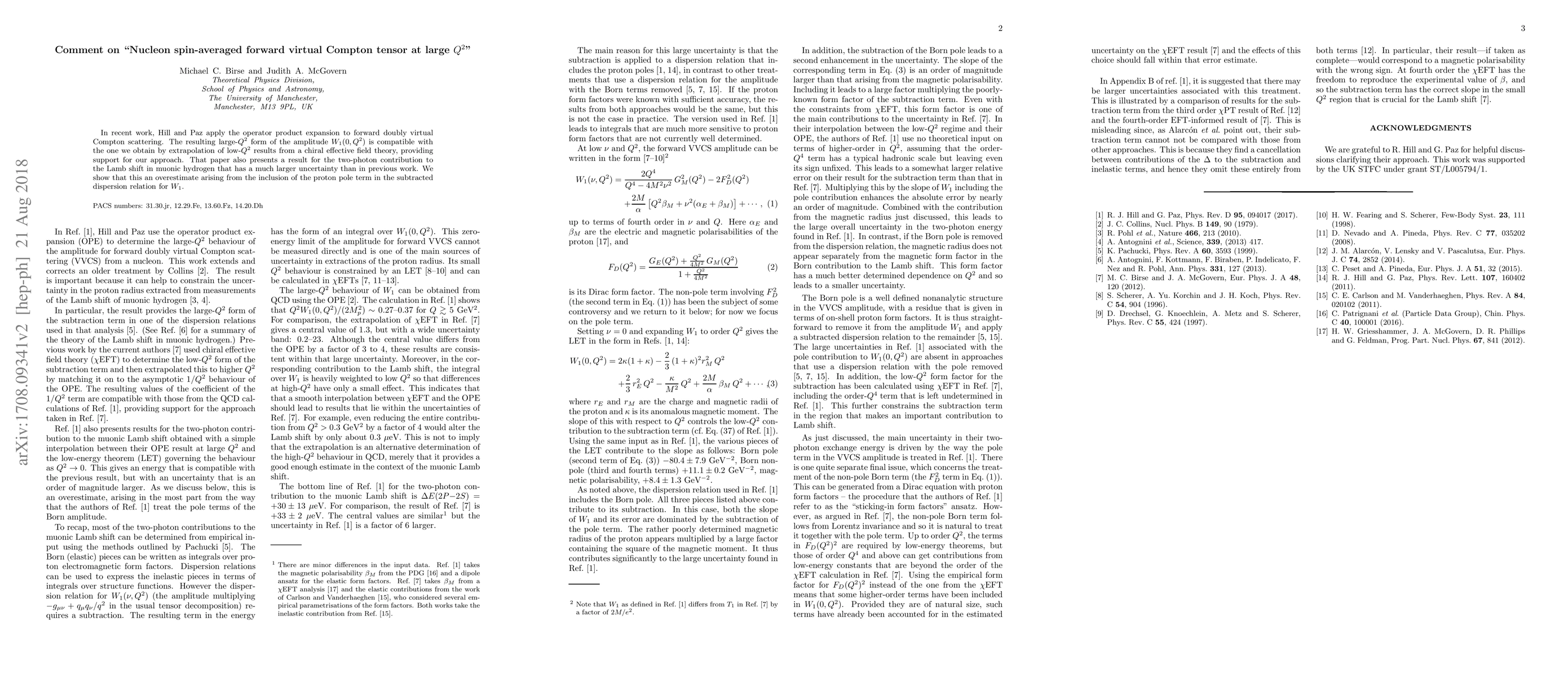 In recent work, Hill and Paz apply the operator product expansion to forward doubly virtual Compton scattering. The resulting large-$Q^2$ form of the amplitude $W_1(0,Q^2)$ is compatible with the one we obtain by extrapolation of low-$Q^2$ results from a chiral effective field theory, providing support for our approach. That paper also presents a result for the two-photon contribution to the Lamb shift in muonic hydrogen that has a much larger uncertainty than in previous work. We show that this an overestimate arising from the inclusion of the proton pole term in the subtracted dispersion relation for $W_1$.