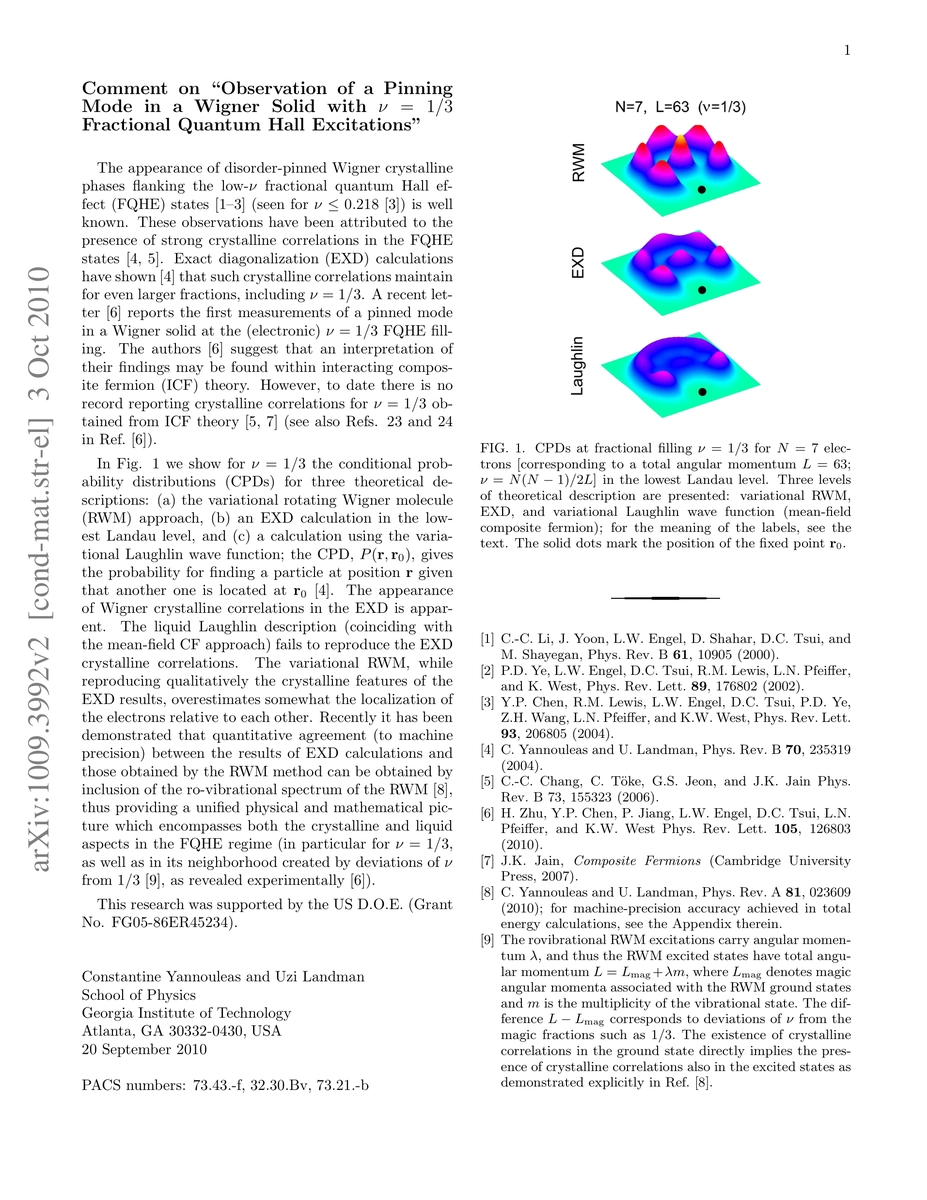This paper discusses the observation of a pinning mode in a Wigner solid at the nu = 1/3 fractional quantum Hall effect, suggesting that the findings align better with the rotating-Wigner-molecule approach rather than the interacting composite fermion theory. It argues that this approach can naturally interpret the crystalline and liquid aspects observed in the FQHE regime.
