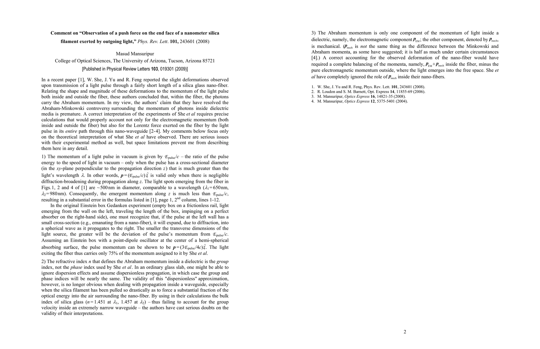 In a recent paper, W. She, J. Yu and R. Feng reported the slight deformations observed upon transmission of a light pulse through a fairly short length of a silica glass nano-fiber. Relating the shape and magnitude of these deformations to the momentum of the light pulse both inside and outside the fiber, these authors concluded that, within the fiber, the photons carry the Abraham momentum. In my view, the authors' claim that they have resolved the Abraham-Minkowski controversy surrounding the momentum of photons inside dielectric media is premature. A correct interpretation of the experiments of She et al requires precise calculations that would properly account not only for the electromagnetic momentum (both inside and outside the fiber) but also for the Lorentz force exerted on the fiber by the light pulse in its entire path through this nano-waveguide.