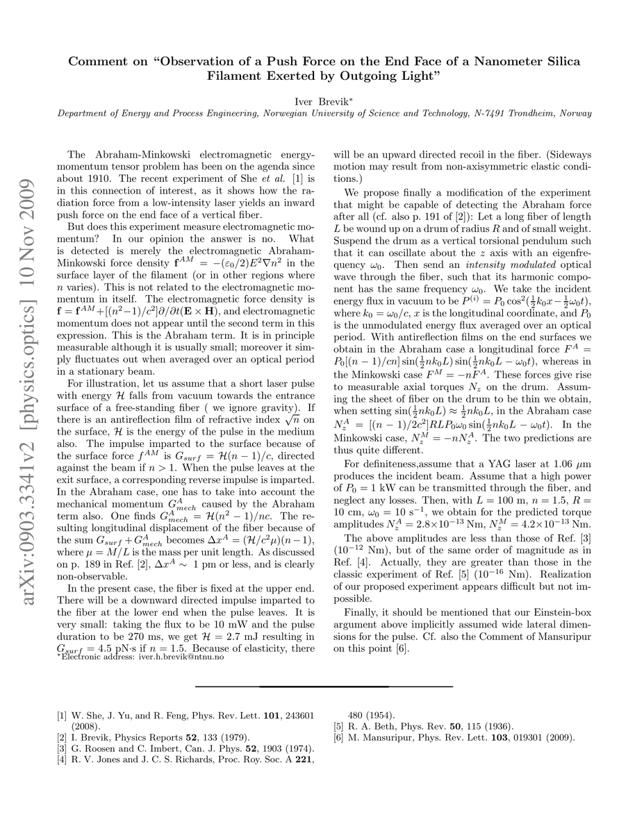 A brief discussion is given on the recent experiment of She et al. [Phys. Rev. Lett. 101, 243601 (2008), arXiv:0806.2442], in relation to the Abraham-Minkowski energy-momentum problem.