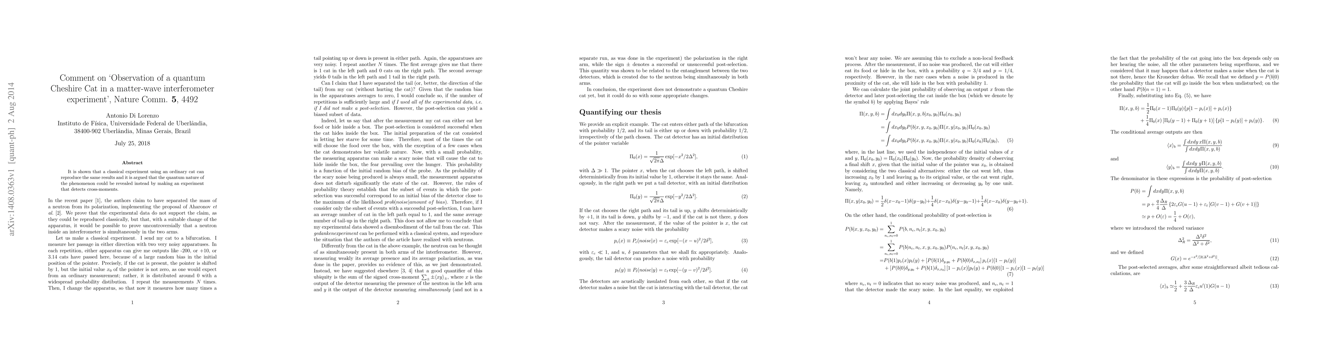 It is shown that a classical experiment using an ordinary cat can reproduce the same results and it is argued that the quantum nature of the phenomenon could be revealed instead by making an experiment that detects cross-moments.
