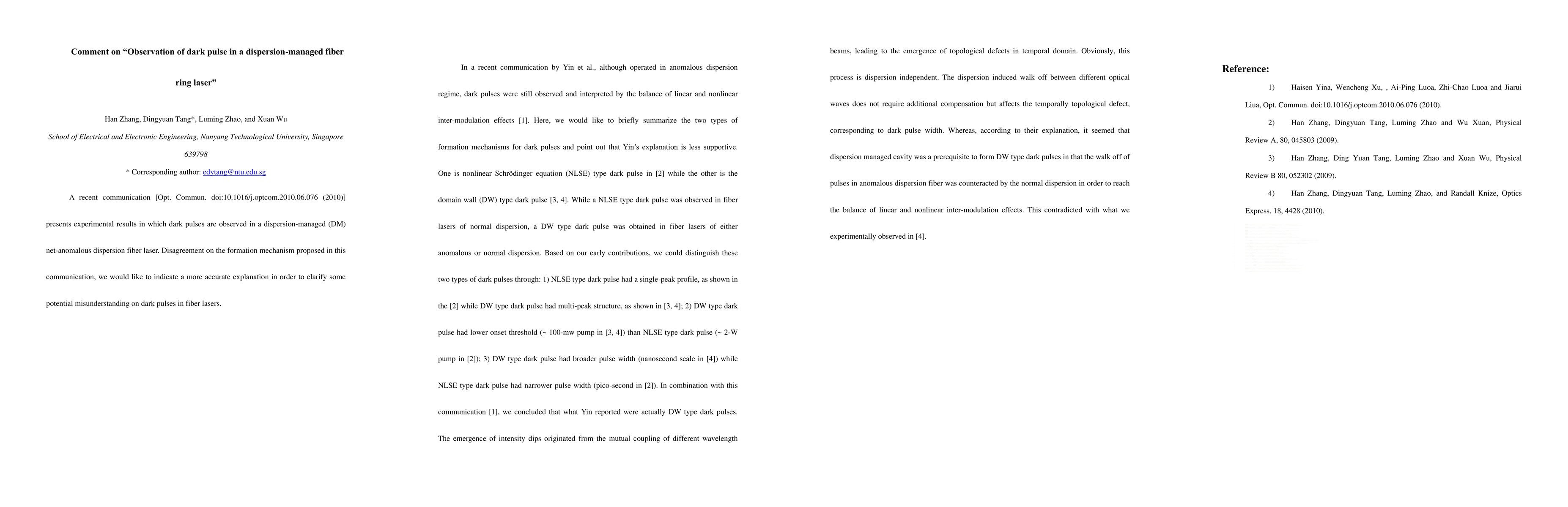 A recent communication [Opt. Commun. doi:10.1016/j.optcom.2010.06.076 (2010)] presents experimental results in which dark pulses are observed in a dispersion-managed (DM) net-anomalous dispersion fiber laser. Disagreement on the formation mechanism proposed in this communication, we would like to indicate a more accurate explanation in order to clarify some potential misunderstanding on dark pulses in fiber lasers.