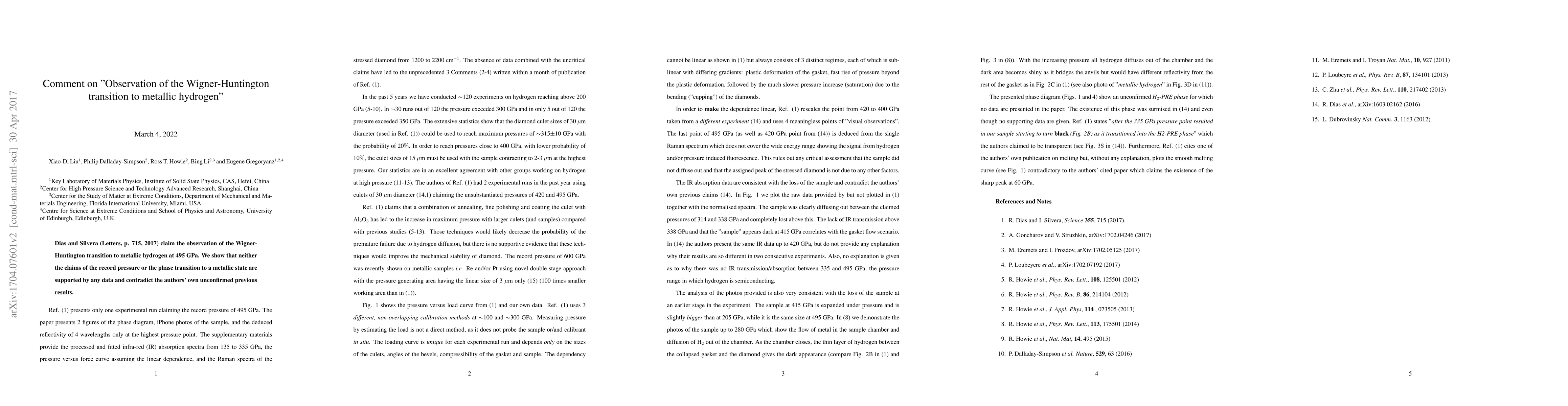 Dias and Silvera (Letters, p. 715, 2017) claim the observation of the Wigner-Huntington transition to metallic hydrogen at 495 GPa. We show that neither the claims of the record pressure or the phase transition to a metallic state are supported by any data and contradict the authors' own unconfirmed previous results.