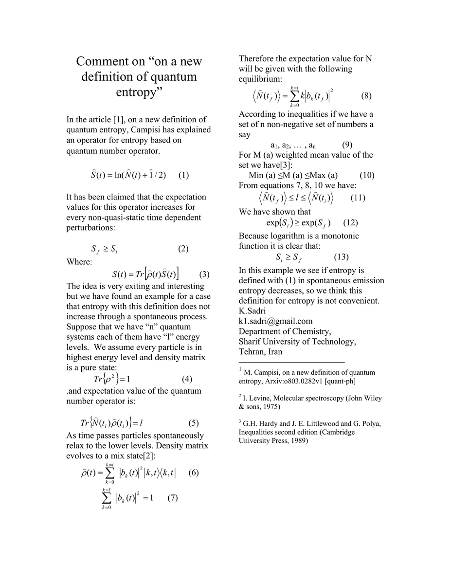 In the article, on a new definition of quantum entropy, Campisi has explained an operator for entropy based on quantum number operator. It has been claimed that the expectation values for this operator increases for every non-quasi-static time dependent perturbations. We have found an example for a case that entropy with this definition does not increase through a spontaneous process.
