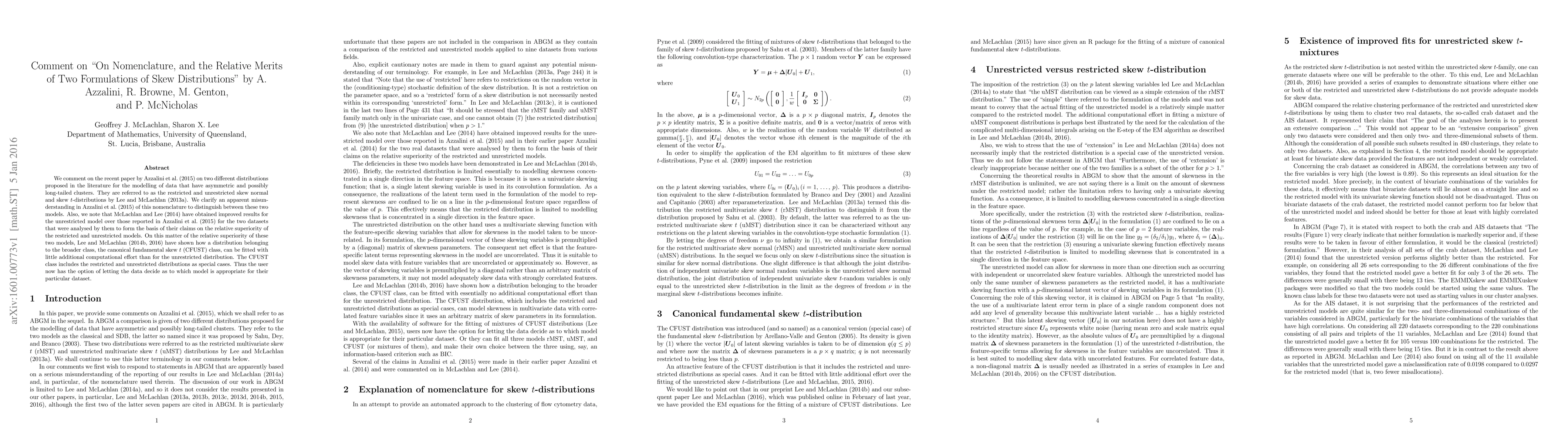 We comment on the recent paper by Azzalini et al. (2015) on two different distributions proposed in the literature for the modelling of data that have asymmetric and possibly long-tailed clusters. They are referred to as the restricted and unrestricted skew normal and skew t-distributions by Lee and McLachlan (2013a). We clarify an apparent misunderstanding in Azzalini et al.(2015) of this nomenclature to distinguish between these two models. Also, we note that McLachlan and Lee (2014) have obtained improved results for the unrestricted model over those reported in Azzalini et al. (2015) for the two datasets that were analysed by them to form the basis of their claimson the relative superiority of the restricted and unrestricted models. On this matter of the relative superiority of these two models, Lee and McLachlan (2014b, 2016) have shown how a distribution belonging to the broader class, the canonical fundamental skew t (CFUST) class, can be fitted with little additional computational effort than for the unrestricted distribution. The CFUST class includes the restricted and unrestricted distributions as special cases. Thus the user now has the option of letting the data decide as to which model is appropriate for their particular dataset.