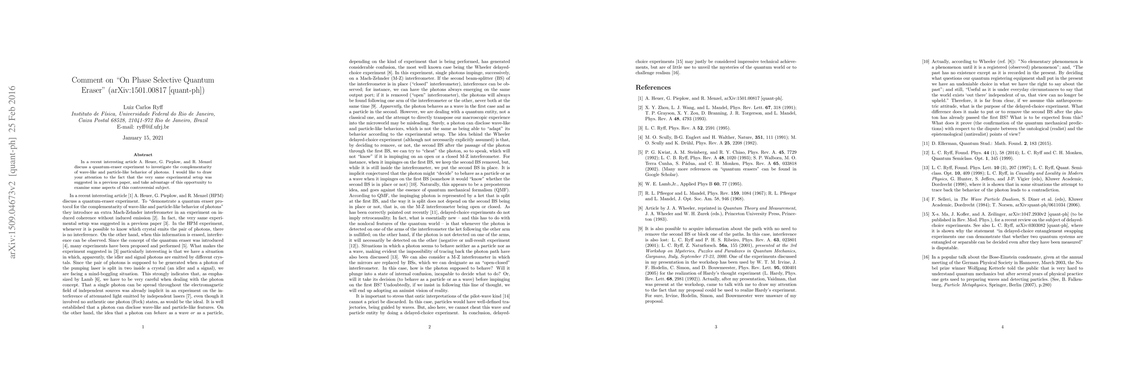 In a recent interesting article A. Heuer, G. Pieplow, and R. Menzel discuss a quantum-eraser experiment to investigate the complementarity of wave-like and particle-like behavior of photons. I would like to draw your attention to the fact that the very same experimental setup was suggested in a previous paper, and take advantage of this opportunity to examine some aspects of this controversial subject.