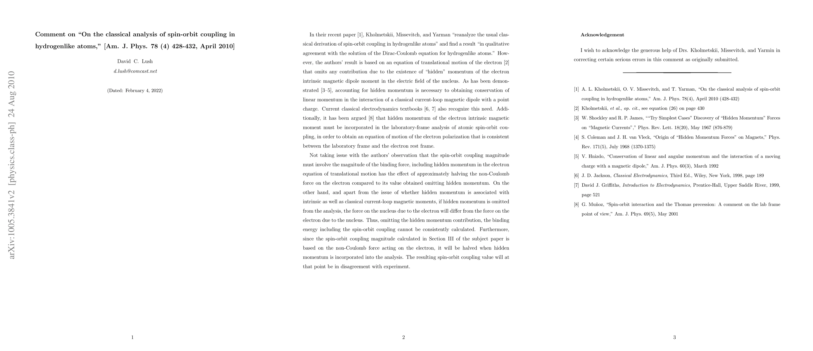 This paper critiques the classical analysis of spin-orbit coupling in hydrogenlike atoms by Kholmetskii et al., arguing that their omission of the electron's "hidden" momentum leads to a force imbalance and a binding energy calculation that disagrees with experimental results. Including hidden momentum is essential for proper conservation of linear momentum in magnetic dipole interactions.
