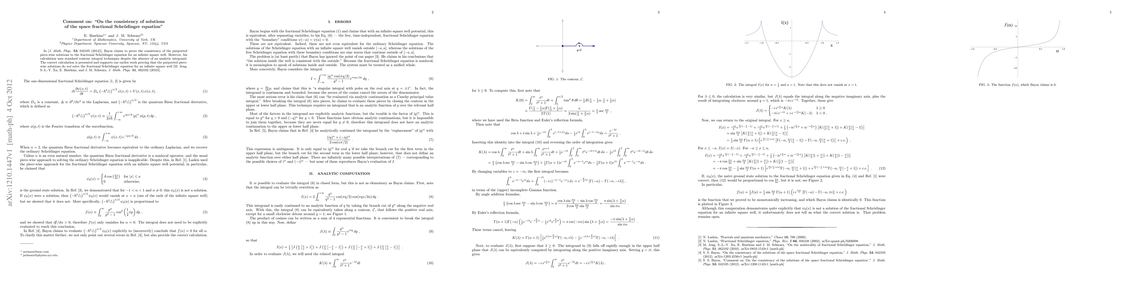 In [J. Math. Phys. 53, 042105 (2012)], Bay{\i}n claims to prove the consistency of the purported piece-wise solutions to the fractional Schr\"odinger equation for an infinite square well. However, his calculation uses standard contour integral techniques despite the absence of an analytic integrand. The correct calculation is presented and supports our earlier work proving that the purported piece-wise solutions do not solve the fractional Schr\"odinger equation for an infinite square well [M. Jeng, S.-L.-Y. Xu, E. Hawkins, and J. M. Schwarz, J. Math. Phys. 51, 062102 (2010)].