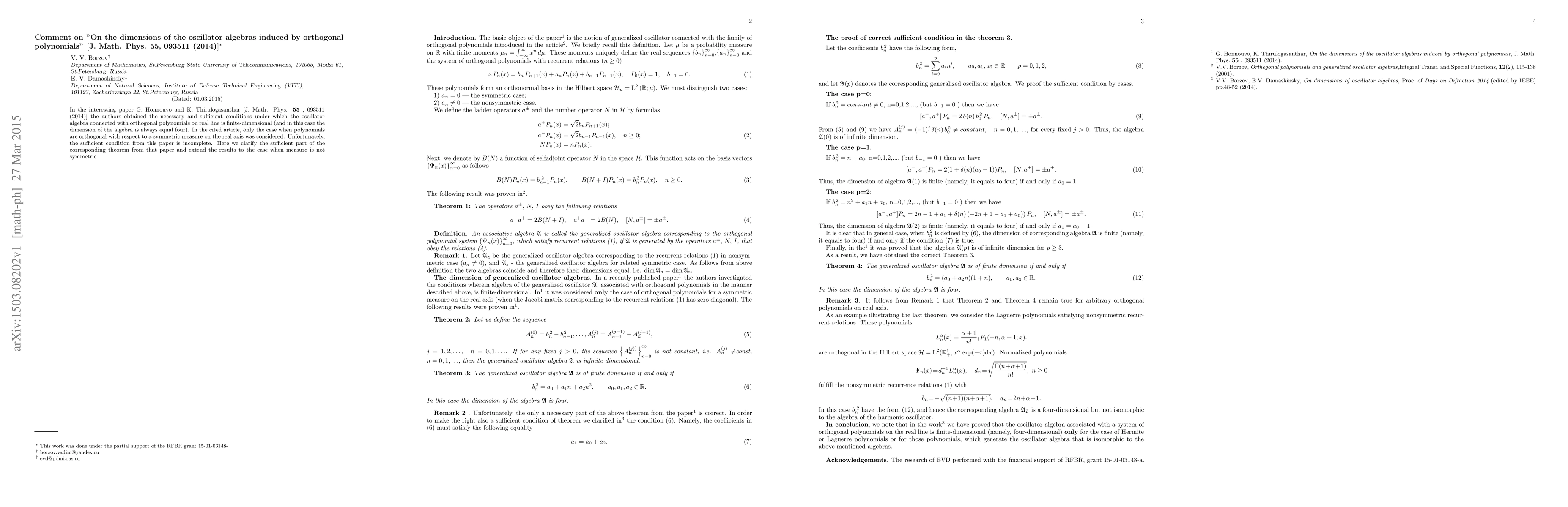 In the interesting paper G. Honnouvo and K. Thirulogasanthar [J. Math. Phys. {\bf 55} , 093511 (2014)] the authors obtained the necessary and sufficient conditions under which the oscillator algebra connected with orthogonal polynomials on real line is finite-dimensional (and in this case the dimension of the algebra is always equal four). In the cited article, only the case when polynomials are orthogonal with respect to a symmetric measure on the real axis was considered. Unfortunately, the sufficient condition from this paper is incomplete. Here we clarify the sufficient part of the corresponding theorem from that paper and extend the results to the case when measure is not symmetric.