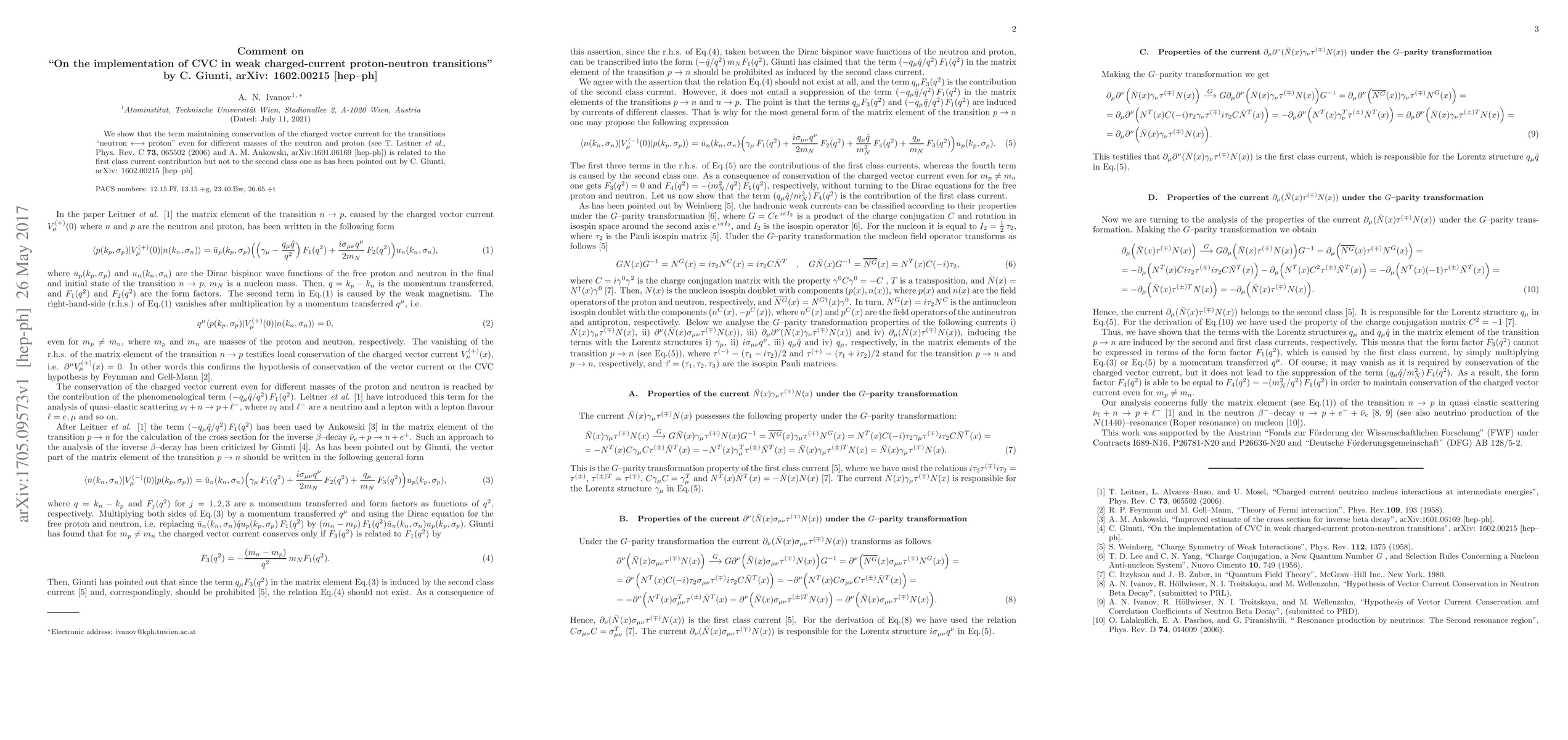 We show that the term maintaining conservation of the charged vector current for the transitions "neutron <-> proton" even for different masses of the neutron and proton (see T. Leitner et al., Phys. Rev. C {\bf 73}, 065502 (2006) and A. M. Ankowski, arXiv:1601.06169 [hep-ph]) is related to the first class current contribution but not to the second class one as has been pointed out by C. Giunti, arXiv: 1602.00215 [hep-ph].