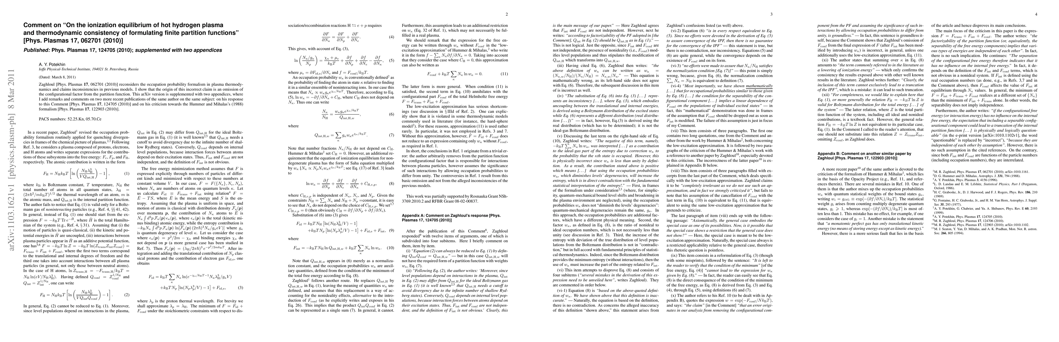 Zaghloul [Phys. Plasmas 17, 062701 (2010); arXiv:1010.1161v1] reconsiders the occupation probability formalism in plasma thermodynamics and claims inconsistencies in previous models. I show that the origin of this incorrect claim is an omission of the configurational factor from the partition function. This arXiv version is supplemented with two appendices, where I add remarks and comments on two more recent publications of the same author on the same subject: on his response to this Comment [Phys. Plasmas 17, 124705 (2010)] and on his criticism towards the Hummer and Mihalas's (1988) formalism [Phys. Plasmas 17, 122903 (2010); arXiv:1010.1102v1].