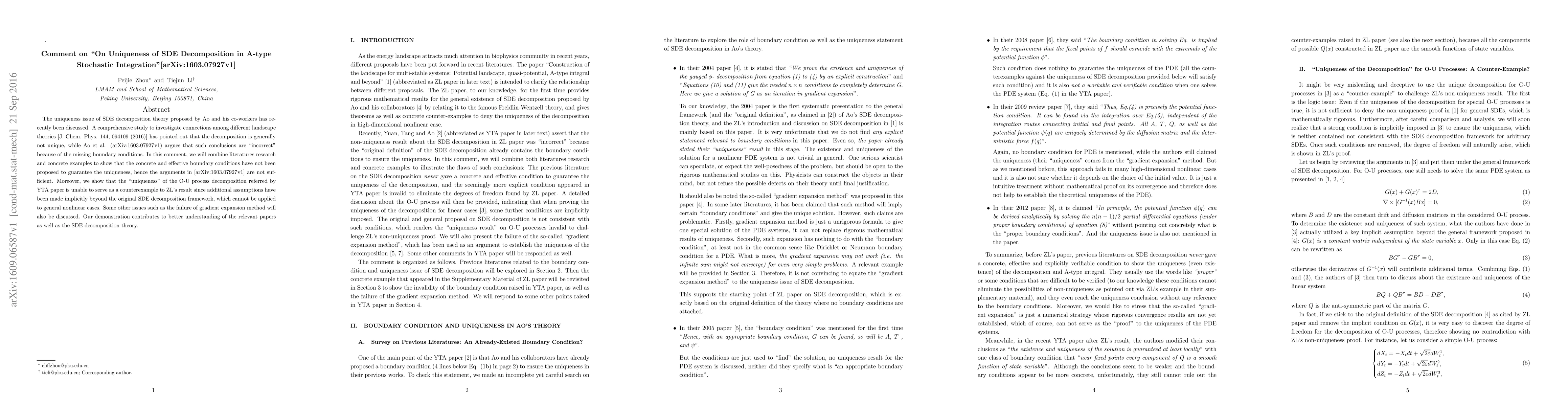 The uniqueness issue of SDE decomposition theory proposed by Ao and his co-workers has recently been discussed. A comprehensive study to investigate connections among different landscape theories [J. Chem. Phys. 144, 094109 (2016)] has pointed out that the decomposition is generally not unique, while Ao et al. (arXiv:1603.07927v1) argues that such conclusions are "incorrect" because of the missing boundary conditions. In this comment, we will combine literatures research and concrete examples to show that the concrete and effective boundary conditions have not been proposed to guarantee the uniqueness, hence the arguments in [arXiv:1603.07927v1] are not sufficient. Moreover, we show that the "uniqueness" of the O-U process decomposition referred by YTA paper is unable to serve as a counterexample to ZL's result since additional assumptions have been made implicitly beyond the original SDE decomposition framework, which cannot be applied to general nonlinear cases. Some other issues such as the failure of gradient expansion method will also be discussed. Our demonstration contributes to better understanding of the relevant papers as well as the SDE decomposition theory.