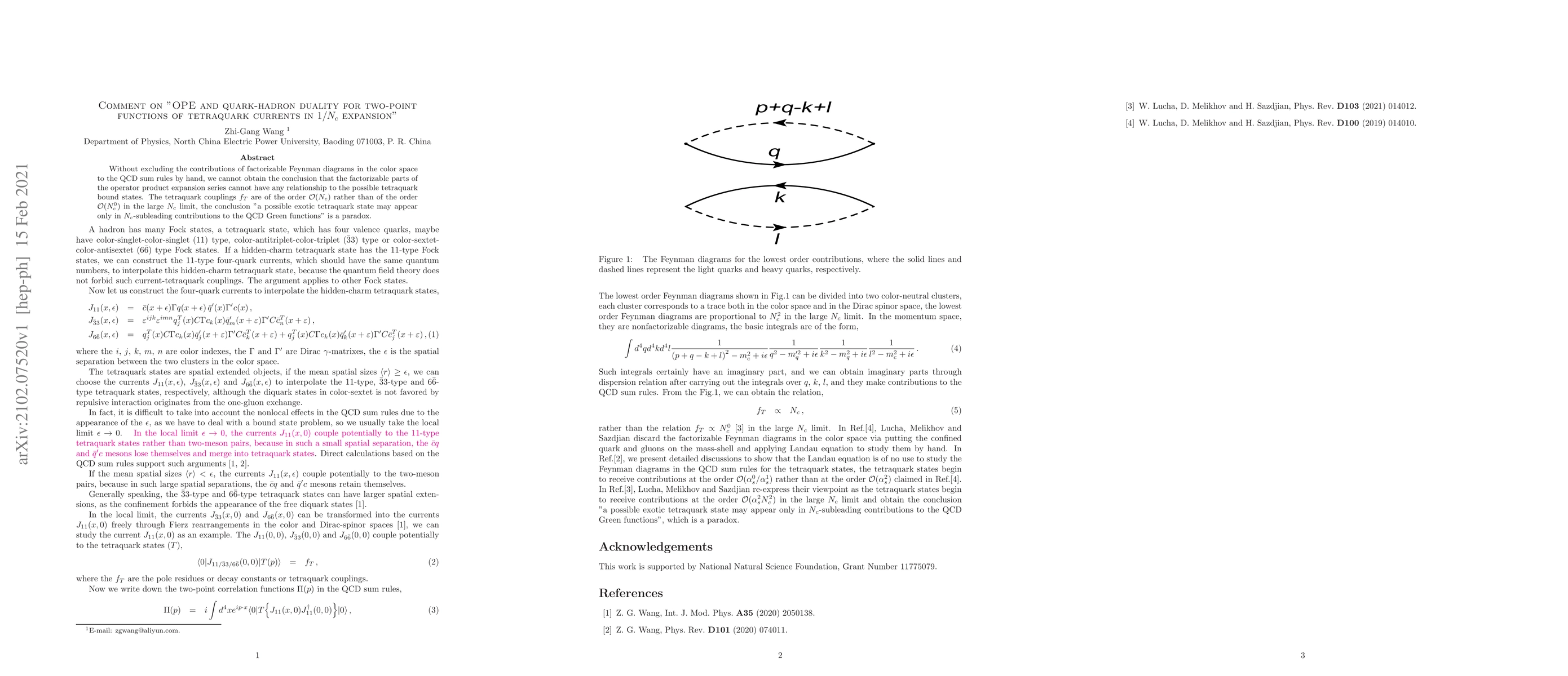 Without excluding the contributions of factorizable Feynman diagrams in the color space to the QCD sum rules by hand, we cannot obtain the conclusion that the factorizable parts of the operator product expansion series cannot have any relationship to the possible tetraquark bound states. The tetraquark couplings $f_T$ are of the order $\mathcal{O}(N_c)$ rather than of the order $\mathcal{O}(N^0_c)$ in the large $N_c$ limit, the conclusion "a possible exotic tetraquark state may appear only in $N_c$-subleading contributions to the QCD Green functions" is a paradox.