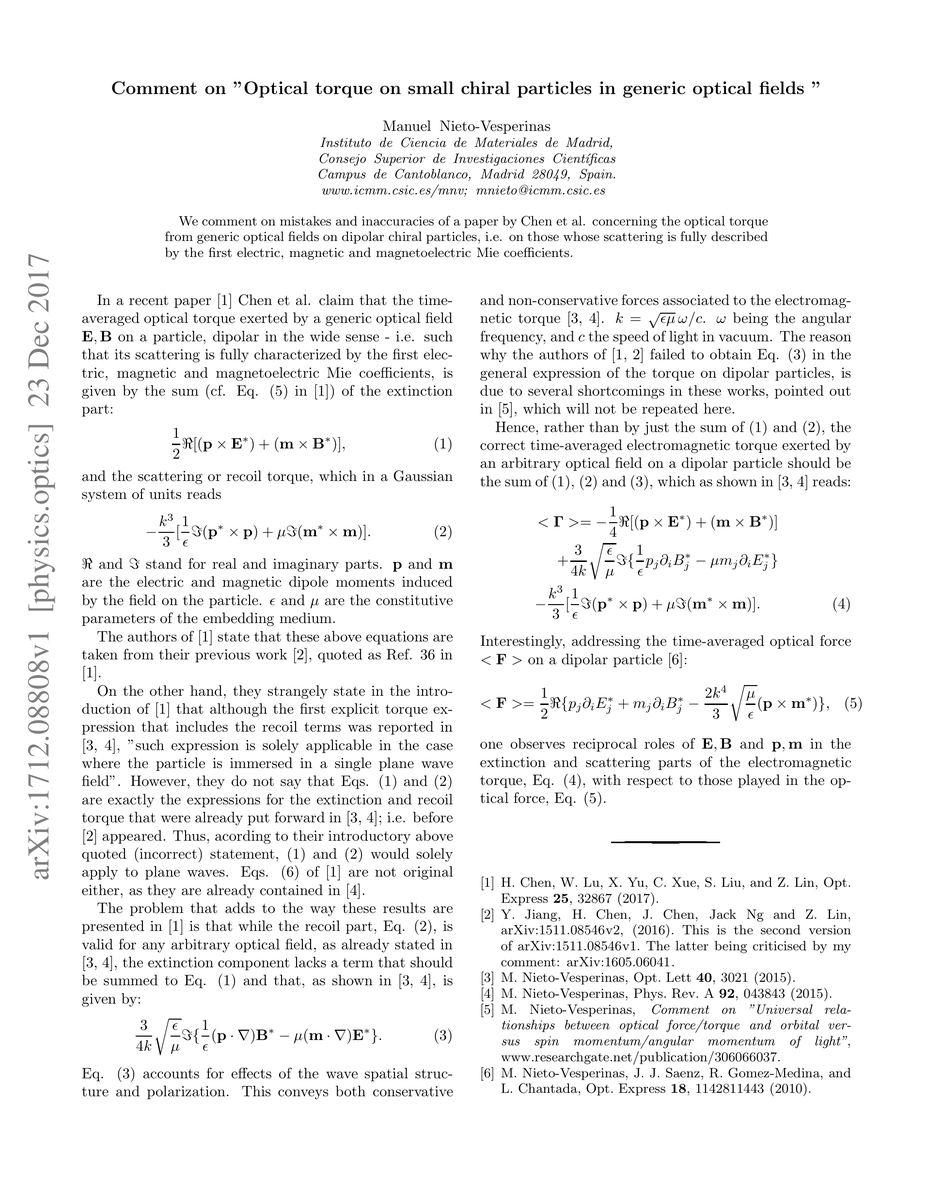 The author comments on mistakes and inaccuracies in a paper by Chen et al., focusing on the optical torque from generic optical fields on dipolar chiral particles.