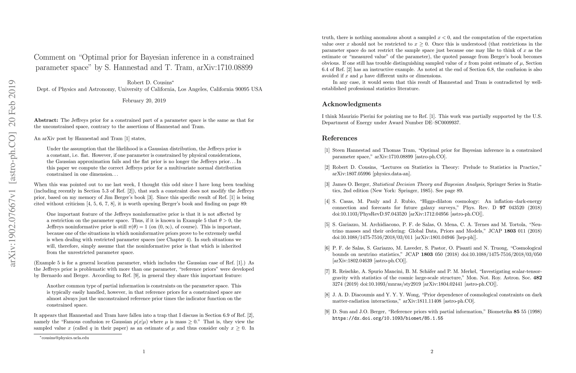 The Jeffreys prior for a constrained part of a parameter space is the same as that for the unconstrained space, contrary to the assertions of Hannestad and Tram.