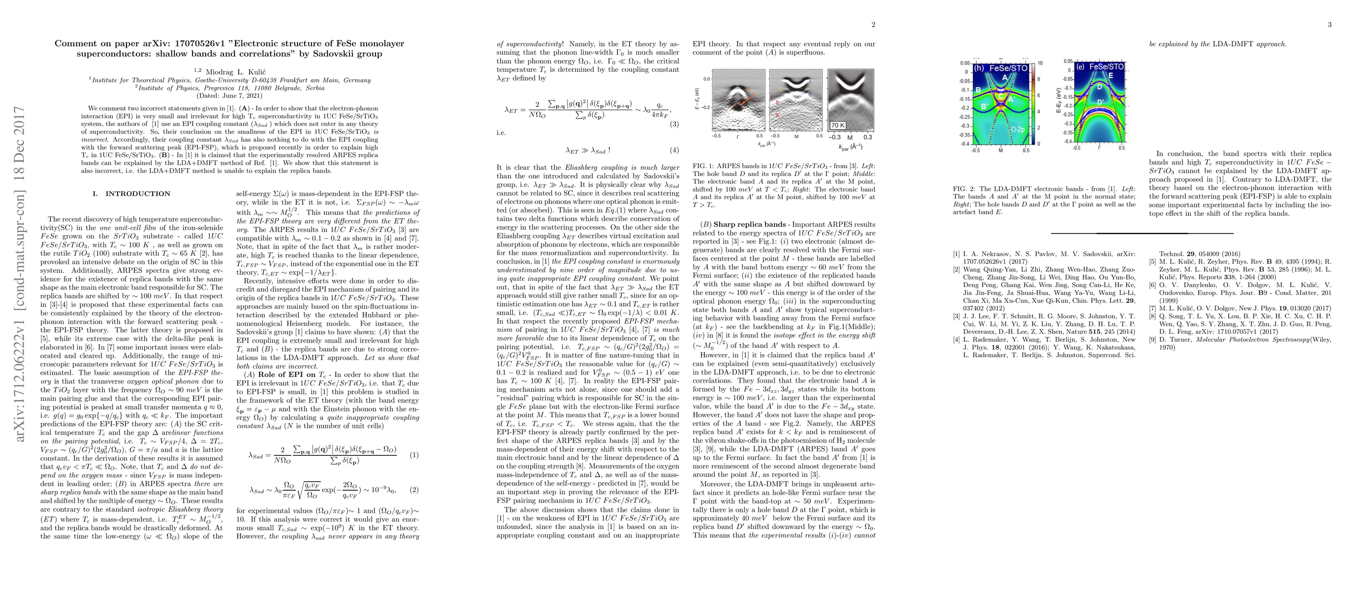 We comment two incorrect statements given in Ref.1. (A) - In order to show that the electron-phonon interaction (EPI) is very small and irrelevant for superconductivity in 1UC FeSe/SrTiO3 system, the authors of Ref.1 use an EPI coupling constant which does not enter in any theory of superconductivity. So, their conclusion on the smallness of the EPI in 1UC FeSe/SrTiO3 is incorrect. Accordingly, their coupling constant has also nothing to do with the EPI coupling with the forward scattering peak (EPI-FSP), which is proposed recently in order to explain high Tc in 1UC FeSe/SrTiO3. (B) - In Ref.1 it is claimed that the experimentally resolved ARPES replica bands can be explained by the LDA+DMFT method. We show that this statement is also incorrect, i.e. the LDA+DMFT method in Ref.1 is unable to explain the replica bands.