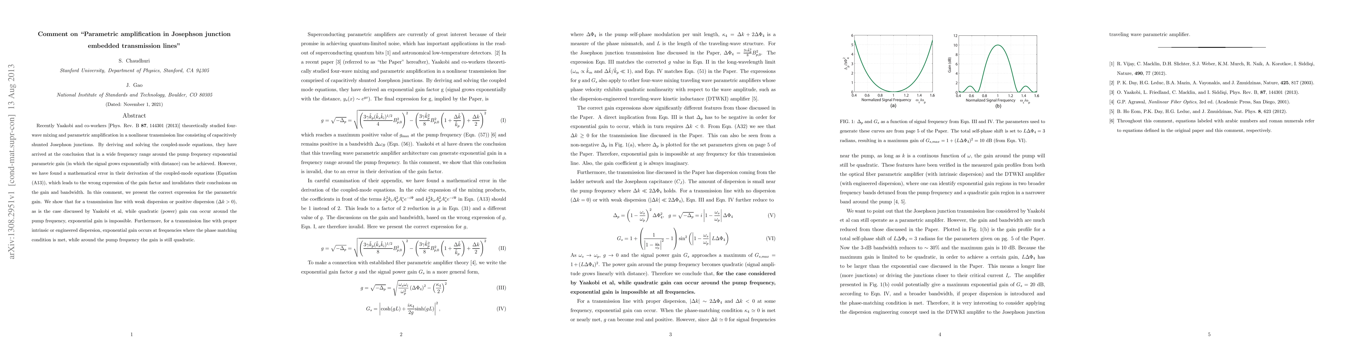 This comment identifies a mathematical error in Yaakobi et al.'s derivation of the coupled-mode equations for parametric amplification in Josephson junction transmission lines, correcting the expression for the gain factor and concluding that exponential gain is impossible under the conditions discussed, while quadratic gain is possible.