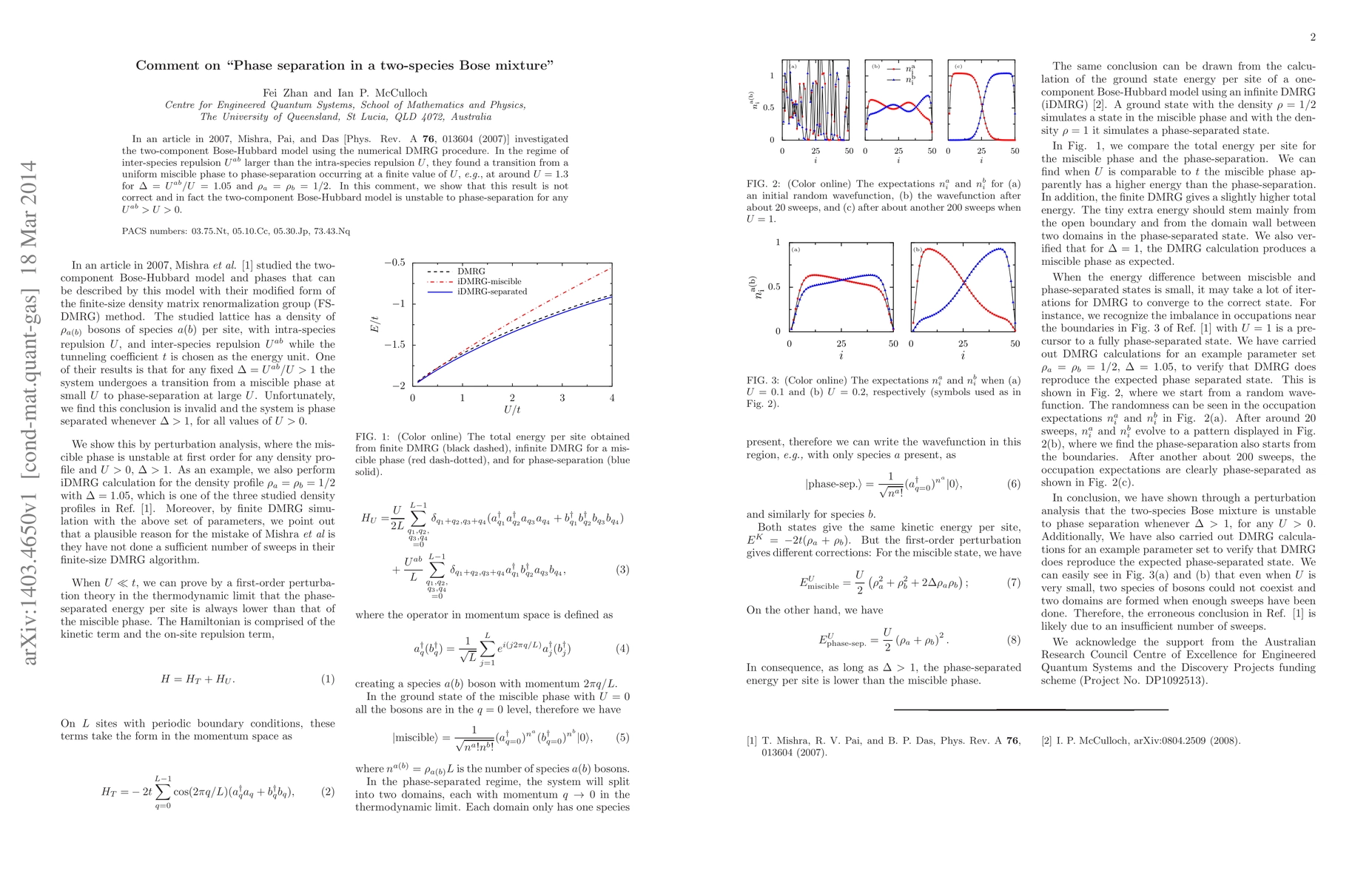 In an article in 2007, Mishra, Pai, and Das [Phys. Rev. A 76, 013604 (2007)] investigated the two-component Bose-Hubbard model using the numerical DMRG procedure. In the regime of inter-species repulsion $U^{ab}$ larger than the intra-species repulsion $U$, they found a transition from a uniform miscible phase to phase-separation occurring at a finite value of $U$ , e.g., at around $U = 1.3$ for $\Delta = U^{ab}/U = 1.05$ and $\rho_{a} = \rho_{b} = 1/2$. In this comment, we show that this result is not correct and in fact the two-component Bose-Hubbard model is unstable to phase-separation for any $U^{ab} > U > 0$.