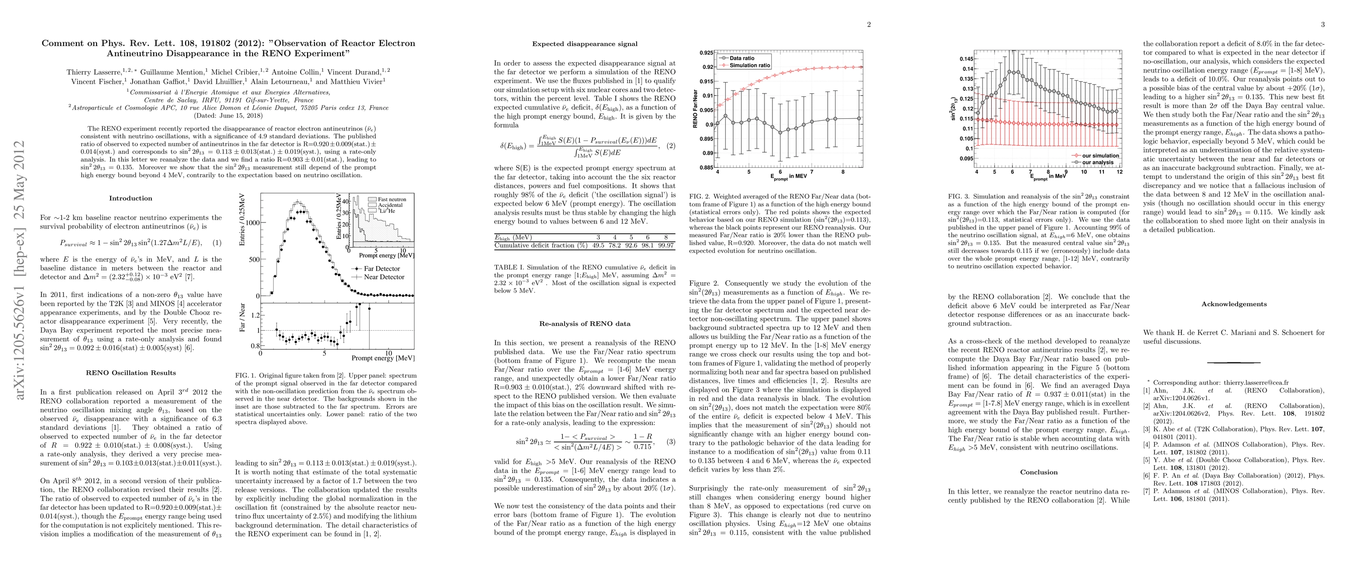 The RENO experiment reanalyzed its data, finding a lower ratio of observed to expected antineutrinos, which leads to a larger measurement of sin^2 2theta13, indicating that the disappearance is not solely due to neutrino oscillations.