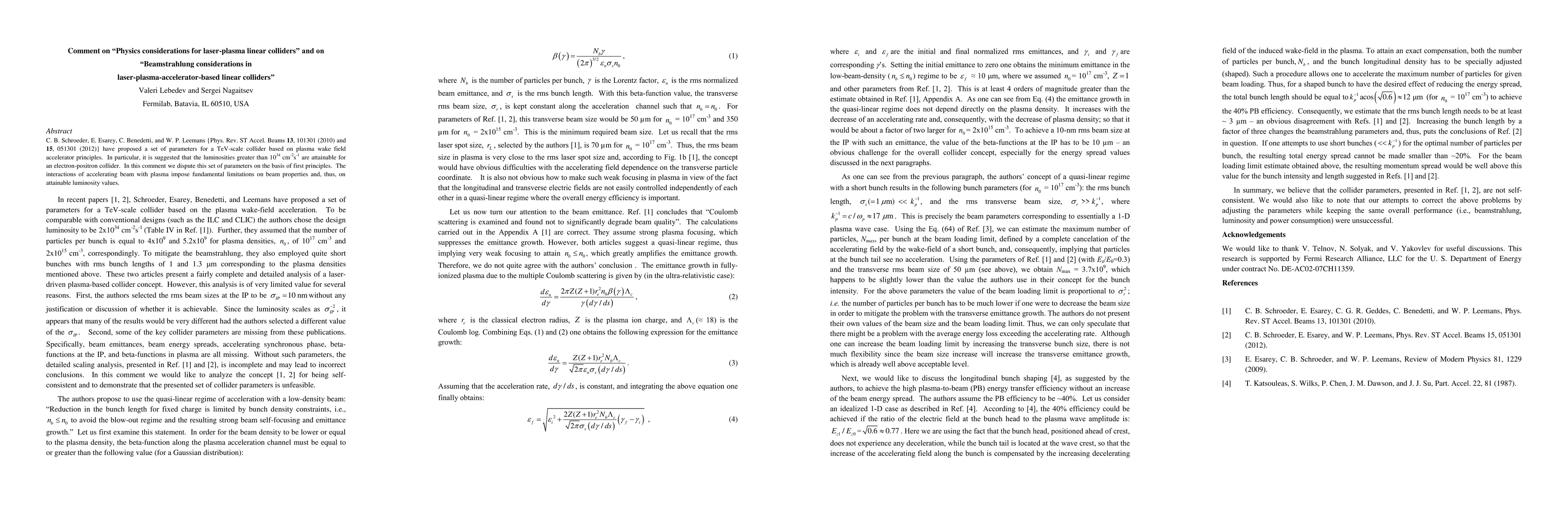 C. B. Schroeder, E. Esarey, C. Benedetti, and W. P. Leemans {Phys. Rev. ST Accel. Beams 13, 101301 (2010) and 15, 051301 (2012)} have proposed a set of parameters for a TeV-scale collider based on plasma wake field accelerator principles. In particular, it is suggested that the luminosities greater than 10^34 cm-2s-1 are attainable for an electron-positron collider. In this comment we dispute this set of parameters on the basis of first principles. The interactions of accelerating beam with plasma impose fundamental limitations on beam properties and, thus, on attainable luminosity values.