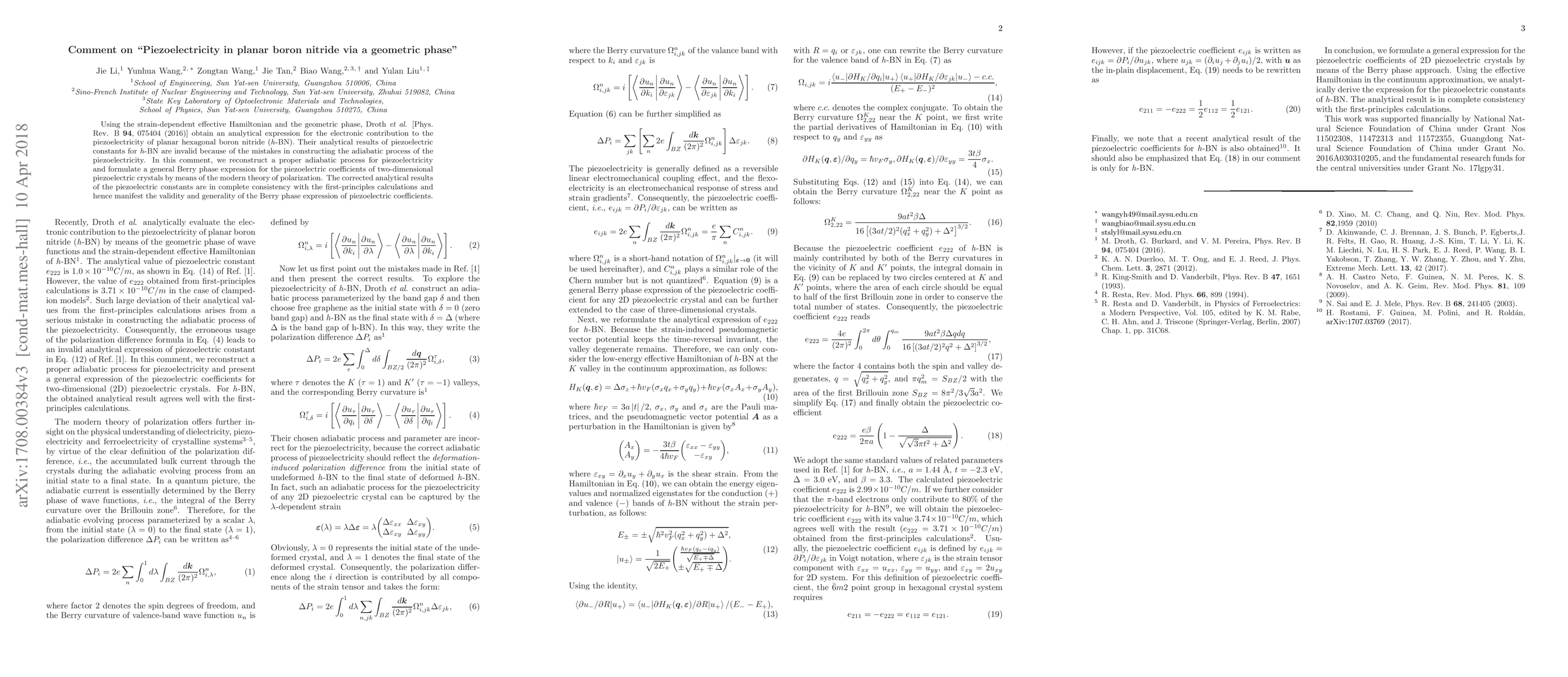 This comment corrects the analytical expression for piezoelectricity in planar hexagonal boron nitride (h-BN) by reconstructing the adiabatic process and formulating a general Berry phase expression, which aligns with first-principles calculations, validating the theory.
