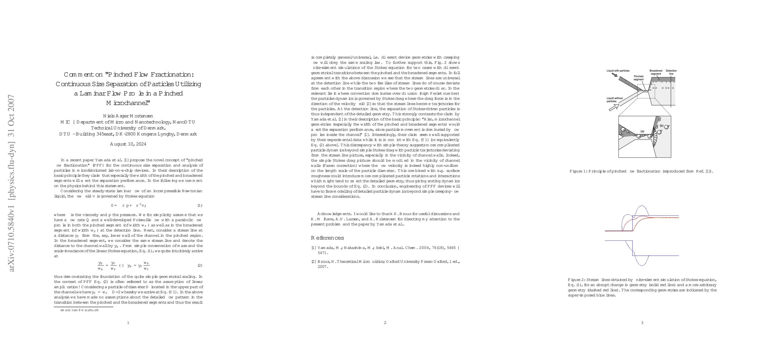 [First paragraph] In a recent paper Yamada et al. propose the novel concept of "pinched flow fractionation" (PFF) for the continuous size separation and analysis of particles in microfabricated lab-on-a-chip devices. In their description of the basic principle they claim that especially the width of the pinched and broadened segments will affect theseparation performance. In the following we comment on the physics behind this statement.