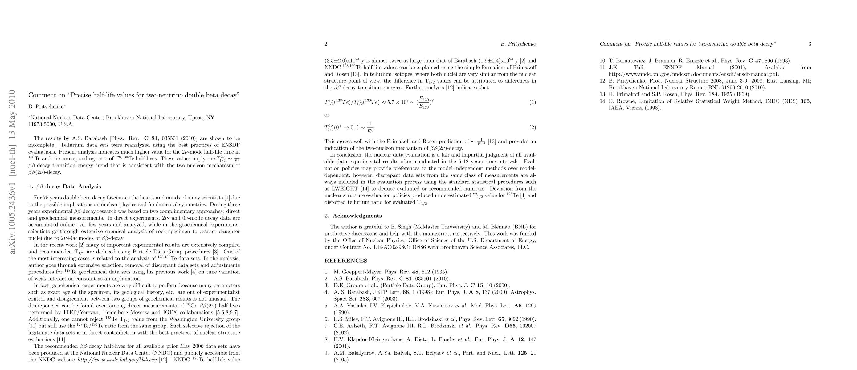 The results by A.S. Barabash [Phys. Rev. {\bf C 81}, 035501 (2010)] are shown to be incomplete. Tellurium data sets were reanalyzed using the best practices of ENSDF evaluations. Present analysis indicates much higher value for the 2$\nu$-mode half-life time in $^{128}$Te and the corresponding ratio of $^{128,130}$Te half-lives. These values imply the $T^{2 \nu}_{1/2}$ $\sim$ $\frac{1}{E^{8}}$ $\beta\beta$-decay transition energy trend that is consistent with the two-nucleon mechanism of $\beta\beta$(2$\nu$)-decay.