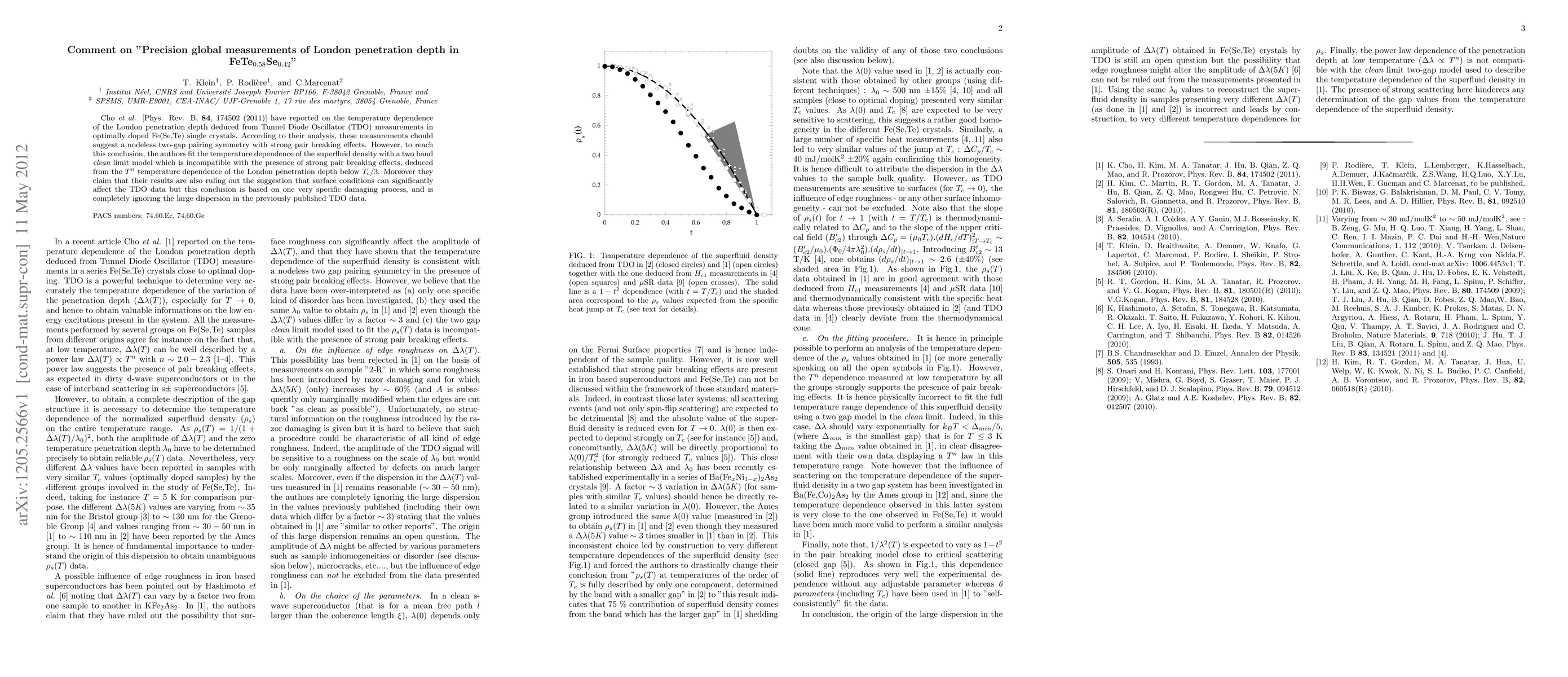 Cho et al. [Phys. Rev. B, 84, 174502 (2011)] have reported on the temperature dependence of the London penetration depth deduced from Tunnel Diode Oscillator (TDO) measurements in optimally doped Fe(Se,Te) single crystals. According to their analysis, these measurements chould suggest a nodeless two-gap pairing symmetry with strong pair breaking effects. However, to reach this conclusion, the authors fit the temperature dependence of the superfluid density with a two band {\it clean} limit model which is incompatible with the presence of strong pair breaking effects, deduced from the $T^n$ temperature dependence of the London penetration depth below $T_c/3$. Moreover they claim that their results are also ruling out the suggestion that surface conditions can significantly affect the TDO data but this conclusion is based on one very specific damaging process, and is completely ignoring the large dispersion in the previously published TDO data.