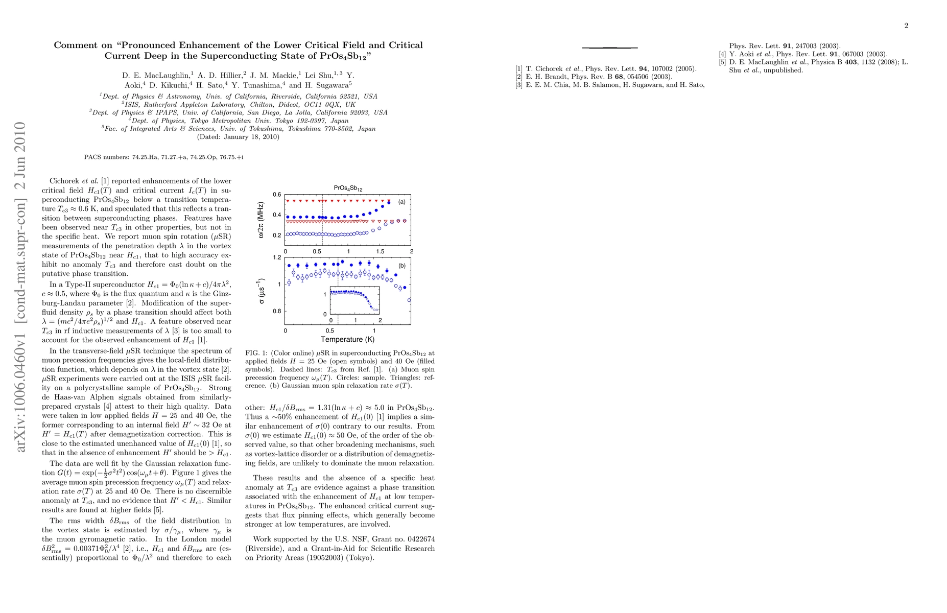 This paper questions Cichorek et al.'s findings on PrOs4Sb12, disputing anomalies in lower critical field and critical current below Tc3 ~ 0.6 K. Muon spin rotation measurements reveal no evidence of a phase transition near Tc3, challenging prior speculations.