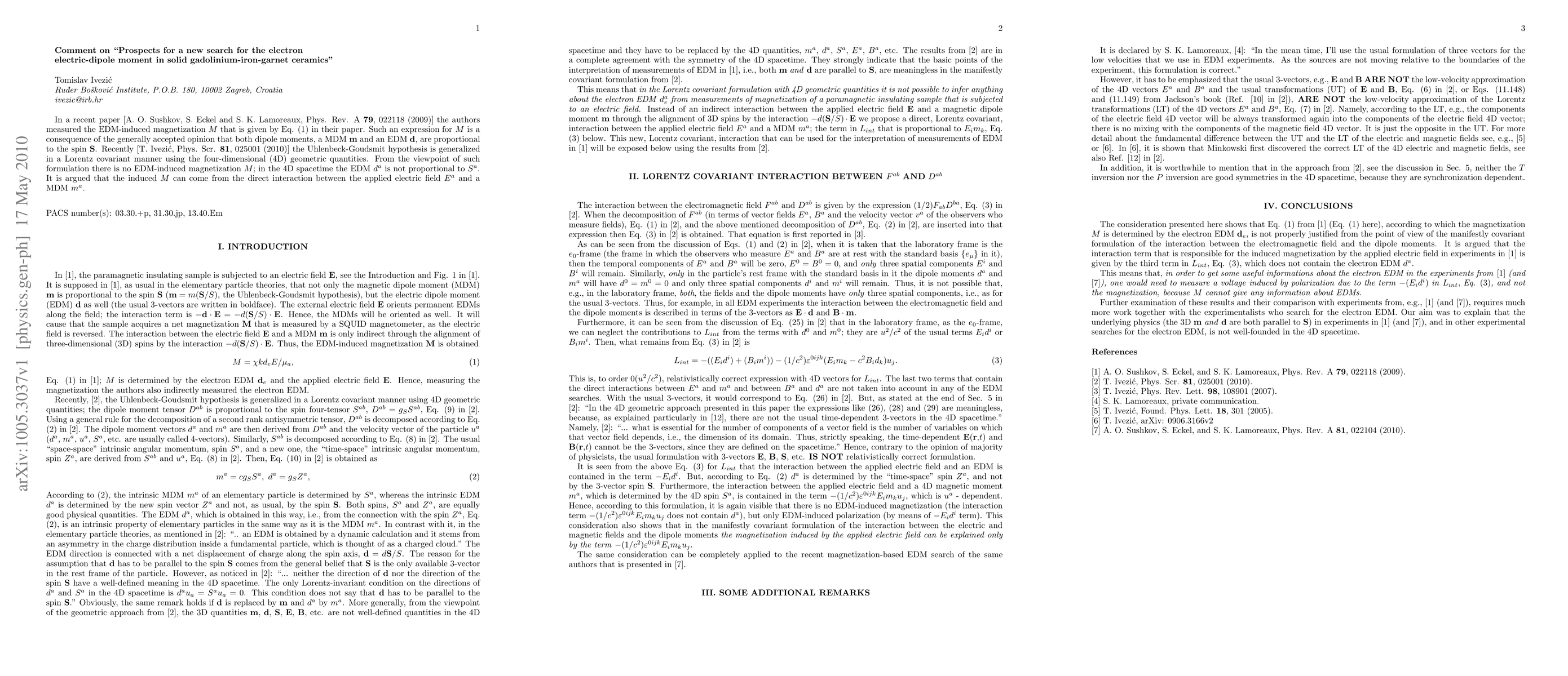In a recent paper [A. O. Sushkov, S. Eckel and S. K. Lamoreaux, Phys. Rev. A 79, 022118 (2009), arXiv:0810.2756 ] the authors measured the EDM-induced magnetization M that is given by Eq. (1) in their paper. Such an expression for M is a consequence of the generally accepted opinion that both dipole moments, a MDM m and an EDM d, are proportional to the spin S. Recently [T. Ivezic, Phys. Scr. 81, 025001 (2010)] the Uhlenbeck-Goudsmit hypothesis is generalized in a Lorentz covariant manner using the four-dimensional (4D) geometric quantities. From the viewpoint of such formulation there is no EDM-induced magnetization M; in the 4D spacetime the EDM d^{a} is not proportional to S^{a}. It is argued that the induced M can come from the direct interaction between the applied electric field E^{a} and a MDM m^{a}.