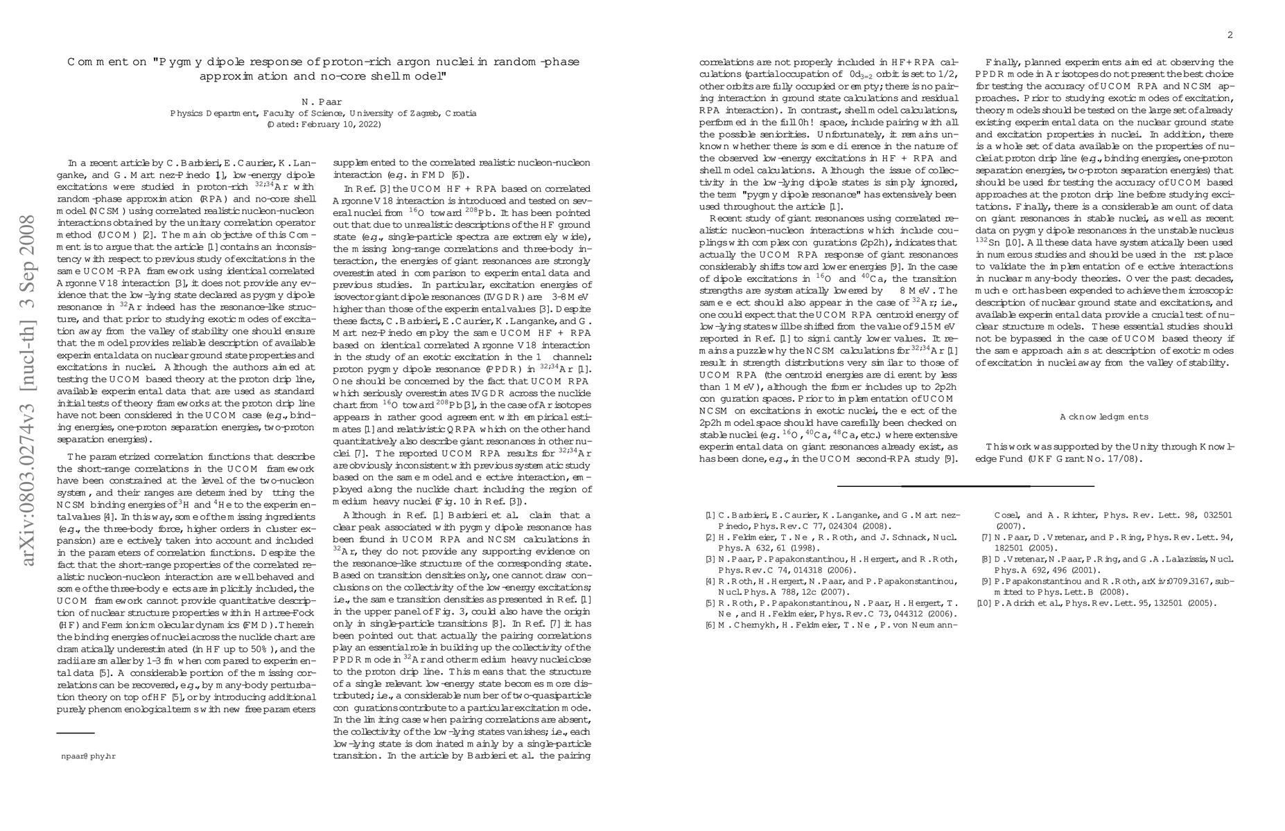 In a recent article by C. Barbieri, E. Caurier, K. Langanke, and G. Mart\'inez-Pinedo \cite{Bar.08}, low-energy dipole excitations were studied in proton-rich $^{32,34}$Ar with random-phase approximation (RPA) and no-core shell model (NCSM) using correlated realistic nucleon-nucleon interactions obtained by the unitary correlation operator method (UCOM) \cite{Fel.98}. The main objective of this Comment is to argue that the article \cite{Bar.08} contains an inconsistency with respect to previous study of excitations in the same UCOM-RPA framework using identical correlated Argonne V18 interaction \cite{Paa.06}, it does not provide any evidence that the low-lying state declared as pygmy dipole resonance in $^{32}$Ar indeed has the resonance-like structure, and that prior to studying exotic modes of excitation away from the valley of stability one should ensure that the model provides reliable description of available experimental data on nuclear ground state properties and excitations in nuclei. Although the authors aimed at testing the UCOM based theory at the proton drip line, available experimental data that are used as standard initial tests of theory frameworks at the proton drip line have not been considered in the UCOM case (e.g., binding energies, one-proton separation energies, two-proton separation energies).