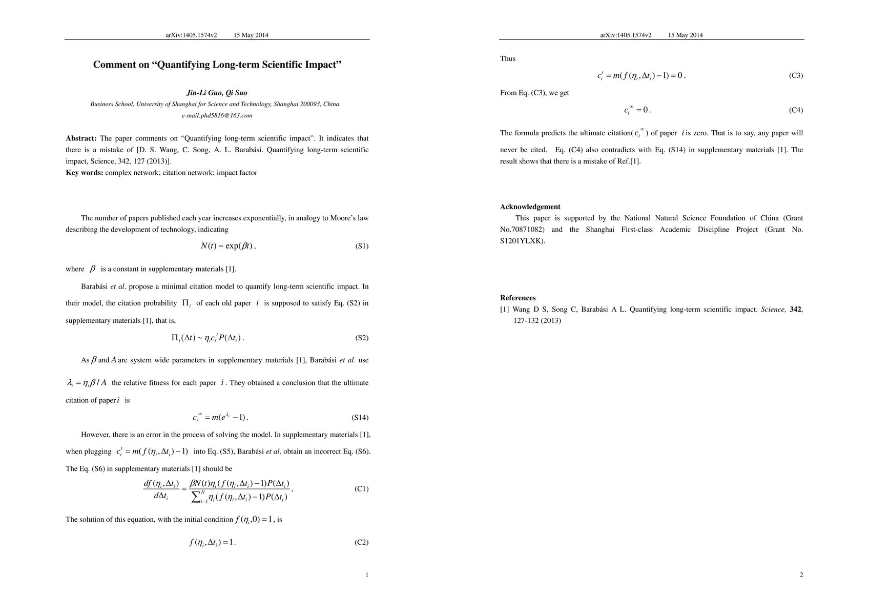 The paper comments on "Quantifying long-term scientific impact". It indicates that there is a mistake of [D. S. Wang , C. Song, A. L. Barabasi, Quantifying long-term scientific impact, Science 342, 127 (2013), arXiv:1306.3293].