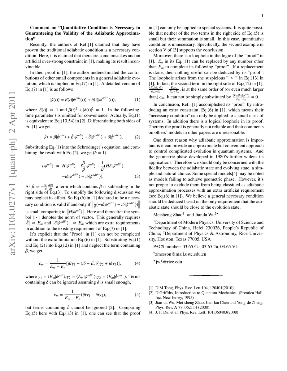 This paper critiques a previous study asserting the necessity of the traditional adiabatic condition, arguing that the author's proof contains errors and an overly stringent constraint, thus rendering their conclusion unconvincing.