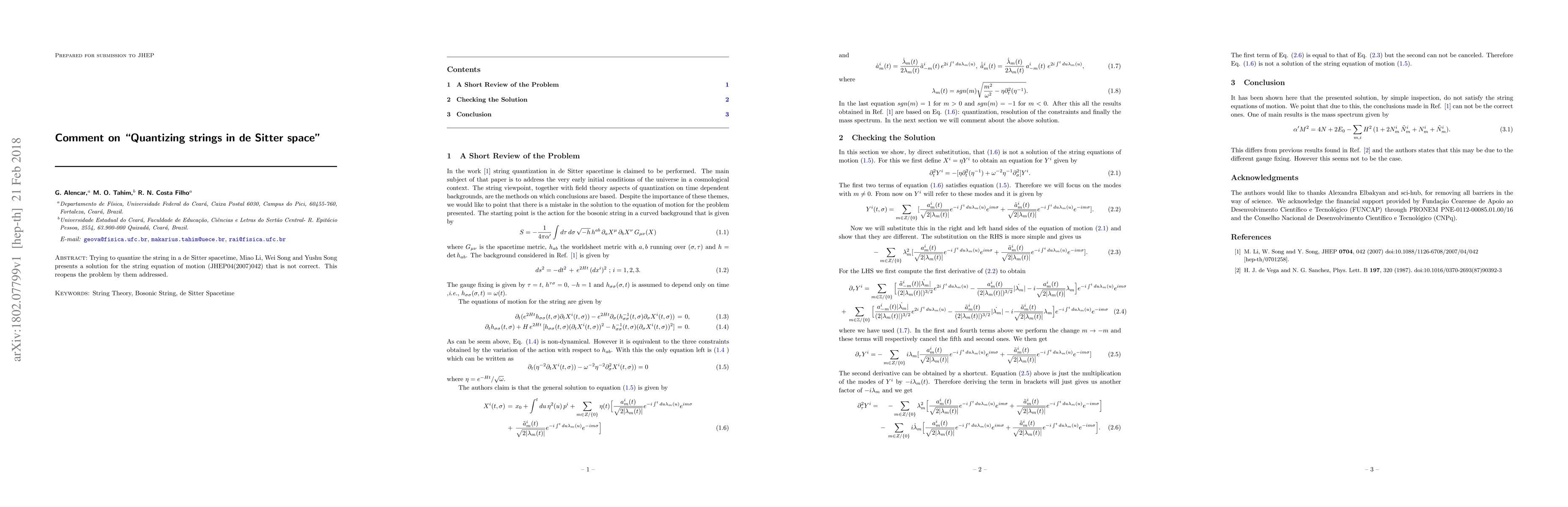 Trying to quantize the string in a de Sitter spacetime, Miao Li, Wei Song and Yushu Song presents a solution for the string equation of motion (JHEP04(2007)042) that is not correct. This reopens the problem by them addressed.