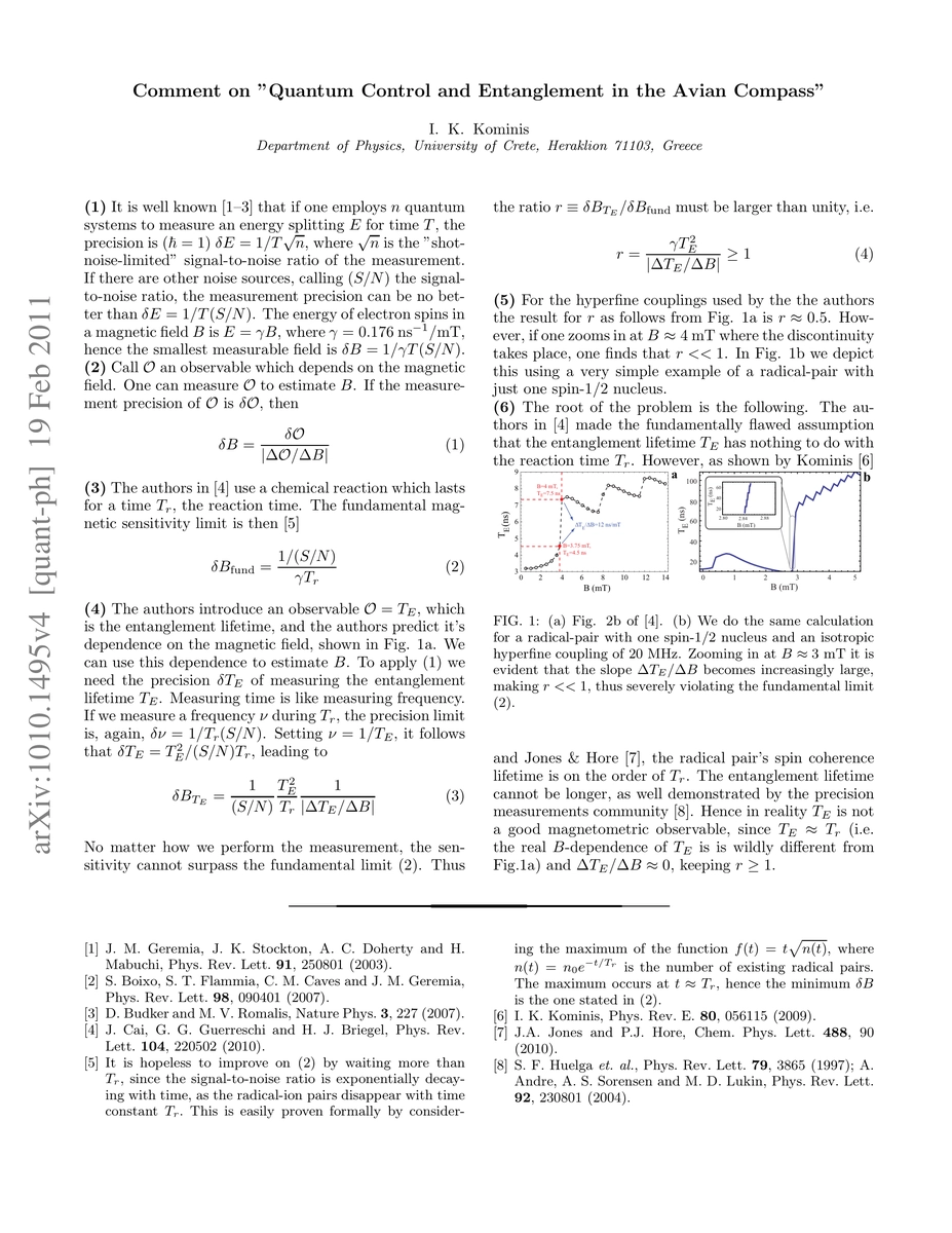 In this comment we show that the avian compass entanglement considerations of J. Cai, G. G. Guerreschi and H. J. Briegel (Phys. Rev. Lett. 104, 220502 (2010)) result in unphysical predictions on the magnetic sensitivity of this biochemical sensor. As well known from a series of papers on precision measurements and detailed derivations of standard quantum limits, not taking into account decoherence results in an overestimate of the entanglement lifetime, and this is the case at hand. The entanglement lifetime is wrongly assumed by the authors to be independent of the reaction time (the inverse of the recombination rate) and hence it is grossly overestimated. This is so because the spin coherence lifetime is limited by the reaction time, and the entanglement lifetime cannot be any longer.