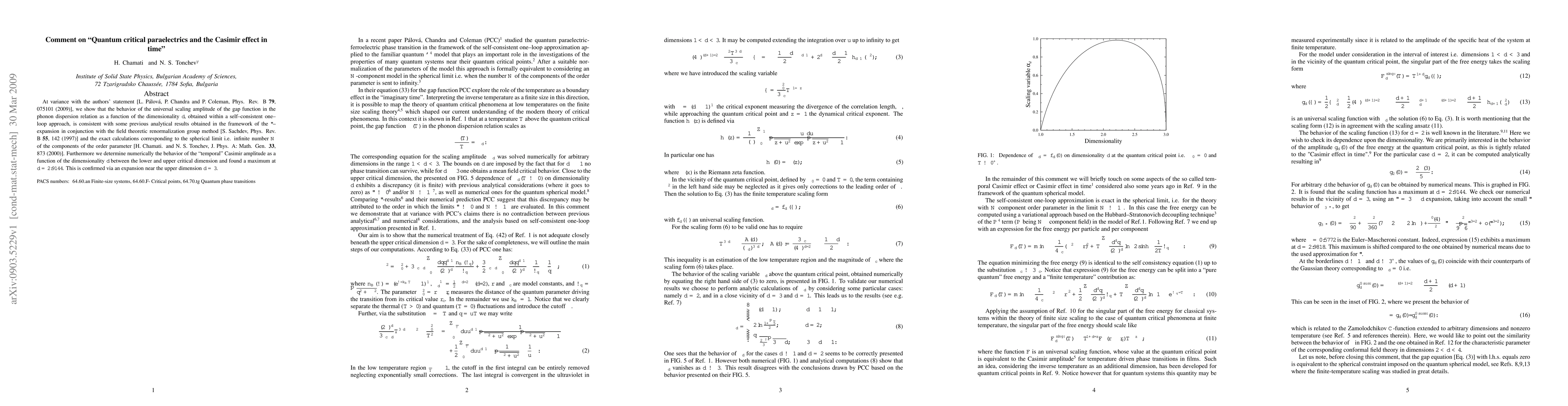 At variance with the authors' statement [L. P\'{a}lov\'{a}, P. Chandra and P. Coleman, Phys. Rev. B 79, 075101 (2009)], we show that the behavior of the universal scaling amplitude of the gap function in the phonon dispersion relation as a function of the dimensionality $d$, obtained within a self--consistent one--loop approach, is consistent with some previous analytical results obtained in the framework of the $\epsilon$--expansion in conjunction with the field theoretic renormalization group method [S. Sachdev, Phys. Rev. B 55, 142 (1997)] and the exact calculations corresponding to the spherical limit i.e. infinite number $N$ of the components of the order parameter [H. Chamati. and N. S. Tonchev, J. Phys. A: Math. Gen. 33, 873 (2000)]. Furthermore we determine numerically the behavior of the "temporal" Casimir amplitude as a function of the dimensionality $d$ between the lower and upper critical dimension and found a maximum at $d=2.9144$. This is confirmed via an expansion near the upper dimension $d=3$.