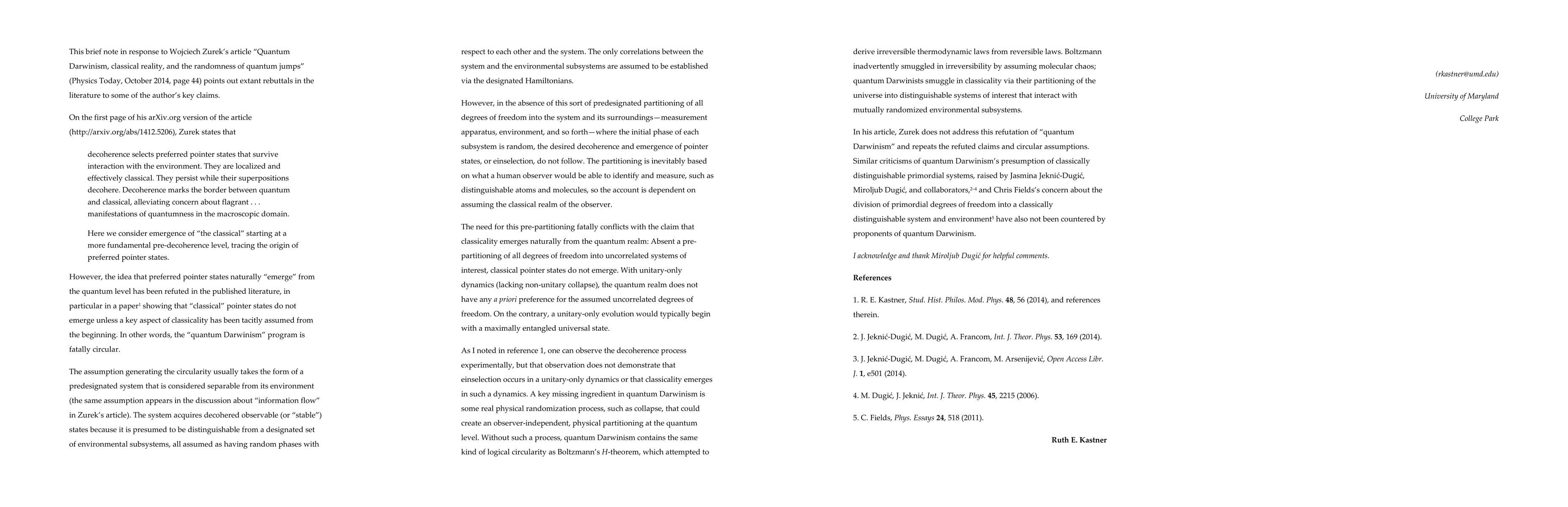 This brief note in response to Wojciech Zurek's article "Quantum Darwinism, classical reality, and the randomness of quantum jumps" (Physics Today, October 2014, page 44) points out extant rebuttals in the literature to some of the author's key claims.