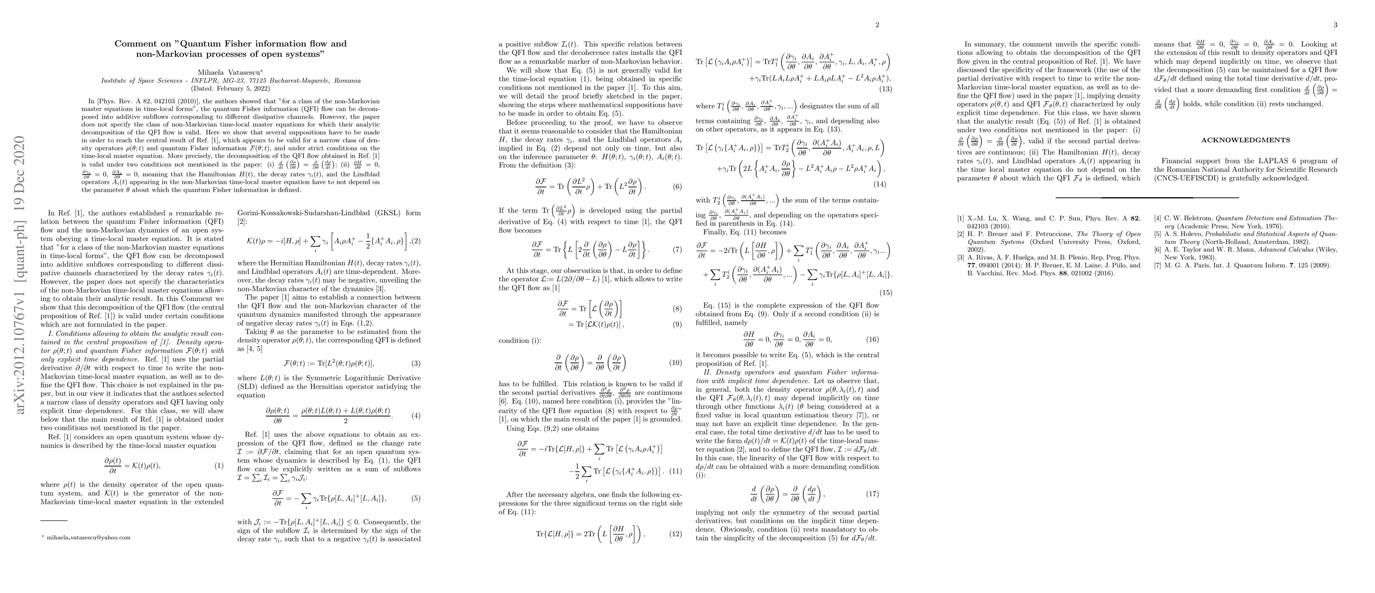 In [Phys. Rev. A 82, 042103 (2010)], the authors showed that "for a class of the non-Markovian master equations in time-local forms", the quantum Fisher information (QFI) flow can be decomposed into additive subflows corresponding to different dissipative channels. However, the paper does not specify the class of non-Markovian time-local master equations for which their analytic decomposition of the QFI flow is valid. Here we show that several suppositions have to be made in order to reach the central result of Ref. \cite{luwsun10}, which appears to be valid for a narrow class of density operators $\rho (\theta;t)$ and quantum Fisher information $\mathcal{F}(\theta;t)$, and under strict conditions on the time-local master equation. More precisely, the decomposition of the QFI flow obtained in Ref. \cite{luwsun10} is valid under two conditions not mentioned in the paper: (i) $\frac{d}{dt} \left( \frac{\partial \rho}{\partial \theta} \right)=$ $\frac{\partial}{\partial \theta} \left( \frac{d \rho}{dt} \right)$; (ii) $\frac{\partial H}{\partial \theta}=0$, $\frac{\partial \gamma_i}{\partial \theta}=0$, $\frac{\partial A_i}{\partial \theta}=0$, meaning that the Hamiltonian $H(t)$, the decay rates $\gamma_i(t)$, and the Lindblad operators $A_i(t)$ appearing in the non-Markovian time-local master equation have to not depend on the parameter $\theta$ about which the quantum Fisher information is defined.
