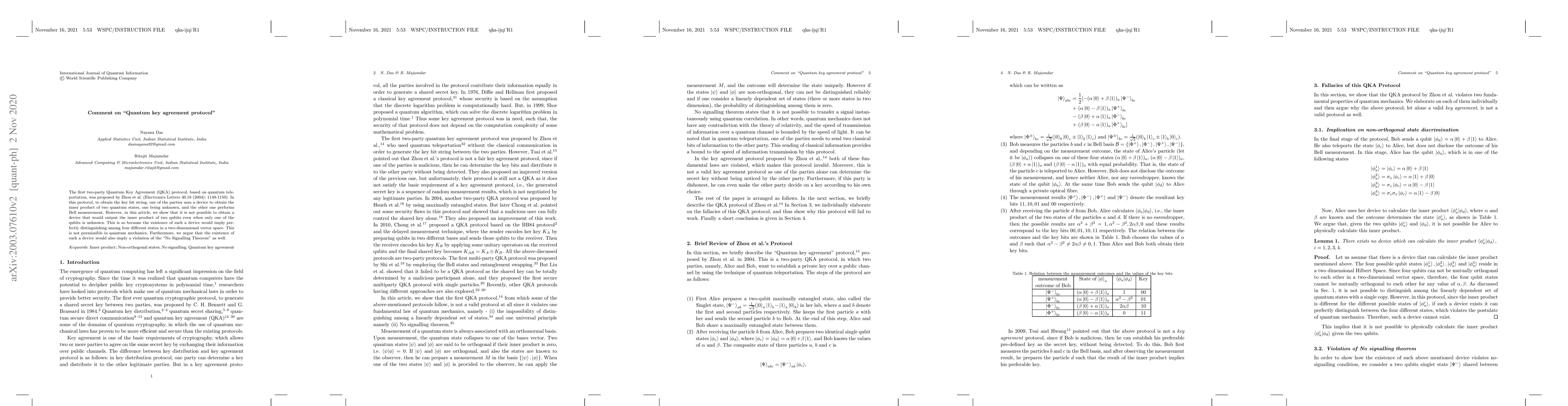 The first two party Quantum Key Agreement (QKA) protocol, based on quantum teleportation, was proposed by Zhou et al. (Electronics Letters 40.18 (2004): 1149-1150). In this protocol, to obtain the key bit string, one of the parties use a device to obtain inner product of two quantum states, one being unknown, and the other one performs Bell measurement. However, in this article, we show that it is not possible to obtain a device that would output the inner product of two qubits even when only one of the qubit is unknown. This is so because existence of such device would imply perfectly distinguishing among four different states in a two-dimensional vector space. This is not permissible in quantum mechanics. Furthermore, we argue that existence of such a device would also imply violation of the "No Signalling Theorem" as well. Finally, we also comment that this protocol is not a valid key agreement protocol at all.