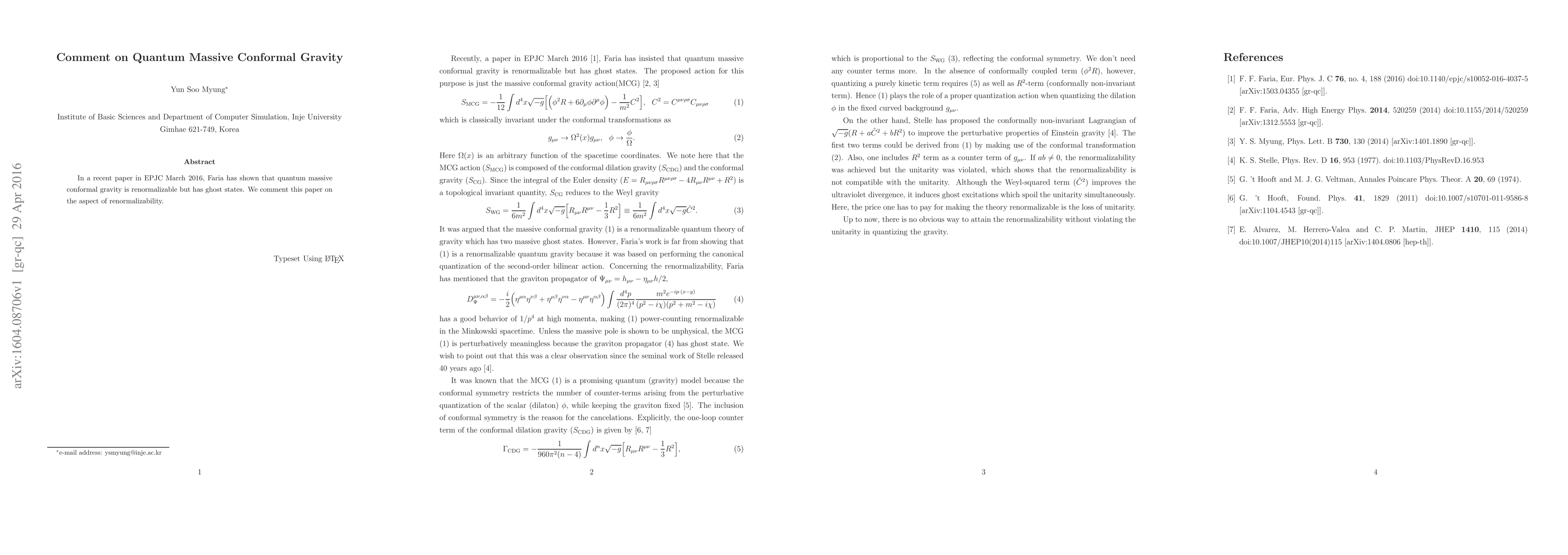 Summary: This paper comments on the renormalizability of quantum massive conformal gravity as demonstrated by Faria in a 2016 EPJC publication, noting that while the theory is renormalizable, it includes ghost states. The focus is on the implications of this renormalizability for the theory's viability.