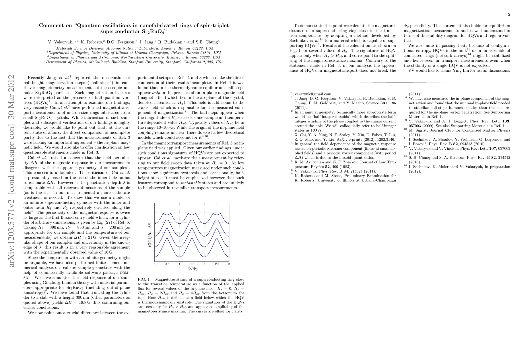 Recently Jang et al. reported the observation of half-height magnetization steps in cantilever magnetometry measurements of mesoscopic annular Sr2RuO4 particles. Such magnetization features were interpreted as the presence of half-quantum vortices. In an attempt to examine our findings, very recently Cai et al. (1202.3146) have performed magnetotransport measurements of micron-size rings fabricated from small Sr2RuO4 crystals. While fabrication of such samples and subsequent verification of our findings is highly desirable, we would like to point out that, at the current state of affairs, the direct comparison is incomplete partly due to the fact that the measurements of Cai et al. were lacking an important ingredient -- the in-plane magnetic field. We would also like to offer clarification on few questionable statements made by the authors of 1202.3146.